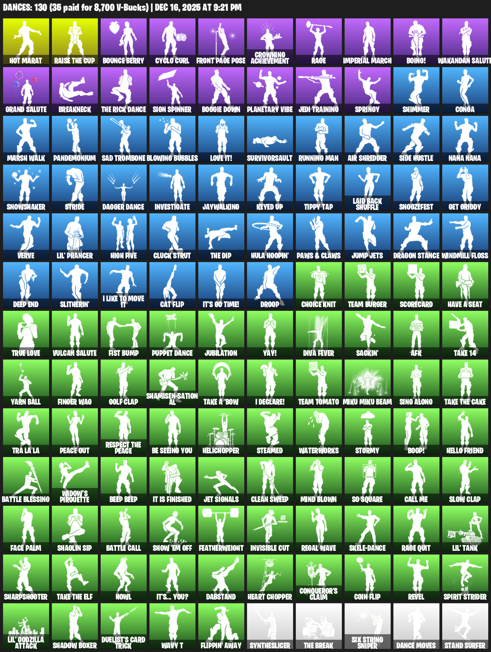 Hot Marat, Bounce Berry, Cyclo Curl, Front Page Pose, Crowning Achievement, Rage, Imperial March, Boing!, Wakandan Salute, Breakneck, Sign Spinner, Boogie Down, Planetary Vibe, Jedi Training, Springy, Shimmer, Conga