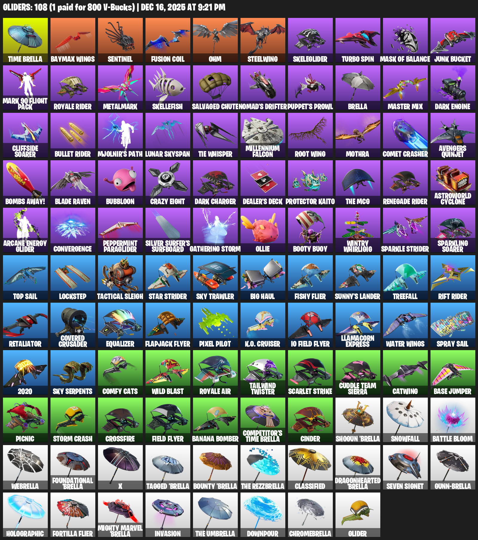 Time Brella, Baymax Wings, Sentinel, Ohm, Steelwing, Skeleglider, Turbo Spin, Mask of Balance, Junk Bucket, Royale Rider, Metalmark, Skellefish, Salvaged Chute, Nomad’s Drifter, Puppet’s Prowl, Master Mix, Dark Engine