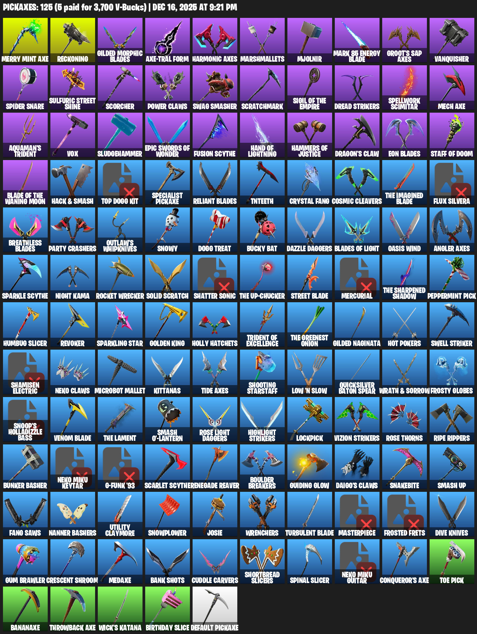 Merry Mint Axe, Reckoning, Gilded Morphic Blades, Harmonic Axes, Marshmallets, Mjolnir, Mark 85 Energy Blade, Vanquisher, Spider Snare, Sulfuric Street Shine, Scorcher, Power Claws, Swag Smasher, Scratchmark, Dread Strikers, Spellwork Scimitar