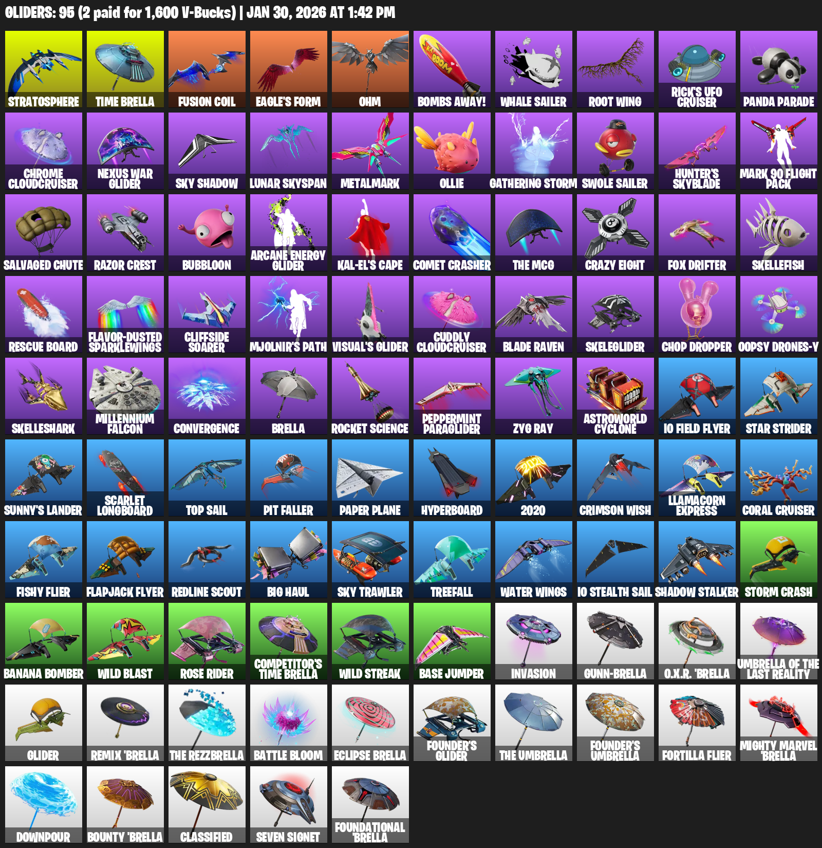 Stratosphere, Time Brella, Eagle’s Form, Ohm, Bombs Away!, Whale Sailer, Root Wing, Rick’s UFO Cruiser, Panda Parade, Chrome Cloudcruiser, Nexus War Glider, Lunar Skyspan, Metalmark, Ollie, Gathering Storm, Hunter’s Skyblade, Mark 90 Flight Pack
