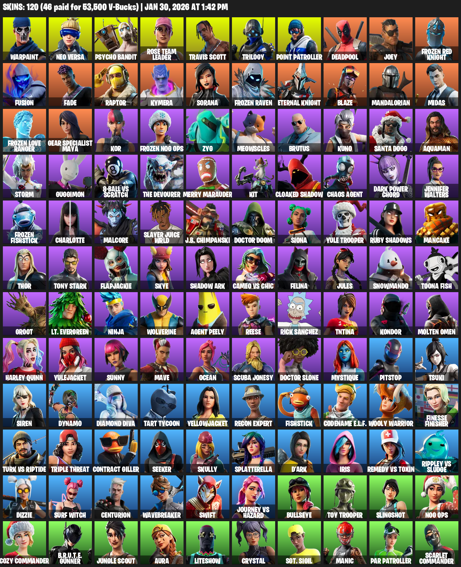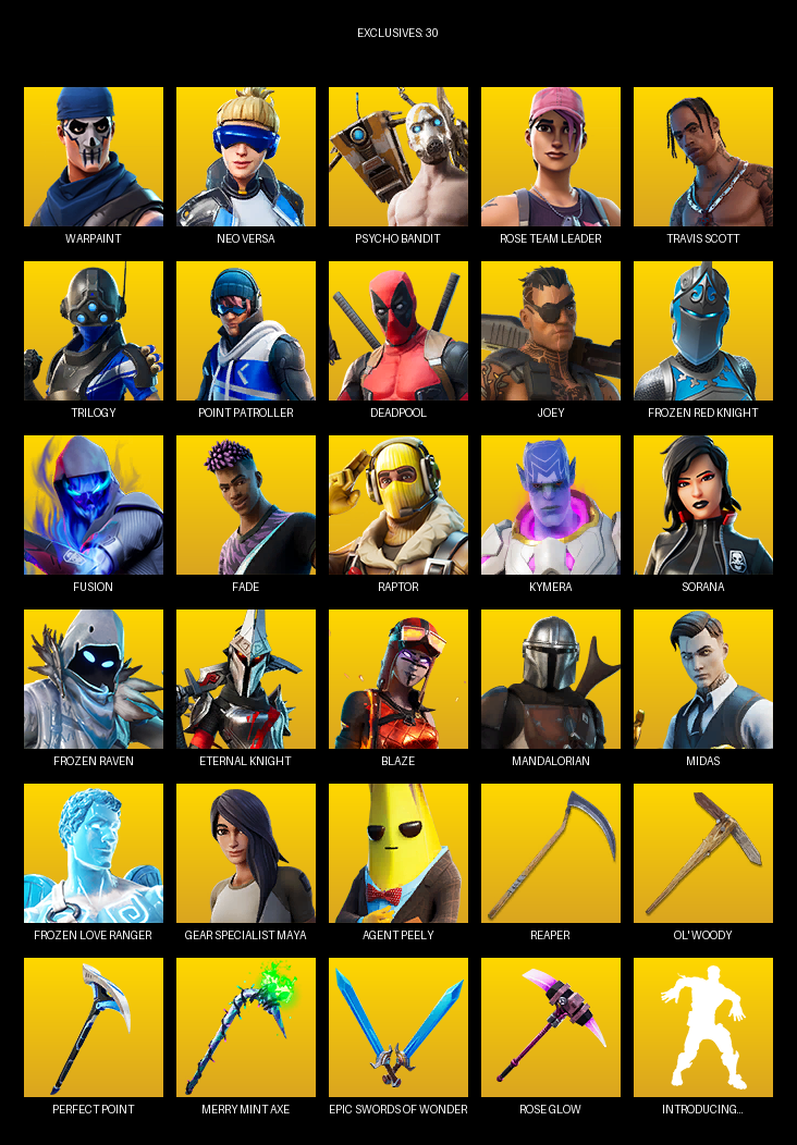 Travis Scott, Point Patroller, Gear Specialist Maya, Warpaint, Neo Versa, Psycho Bandit, Rose Team Leader, Trilogy, Deadpool, Joey, Frozen Red Knight, Fusion, Fade, Raptor, Kymera, Sorana, Blaze, Mandalorian