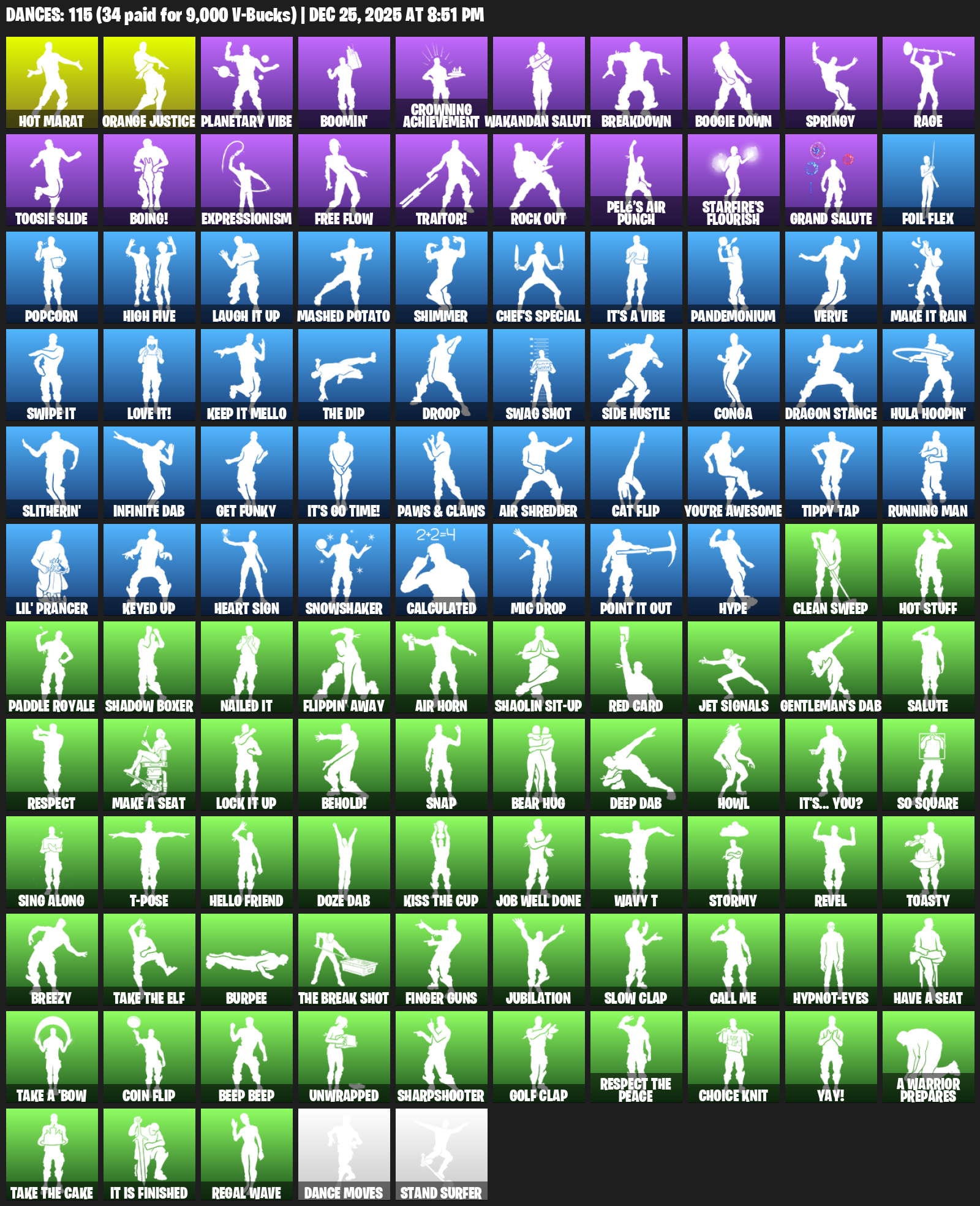 Hot Marat, Orange Justice, Planetary Vibe, Boomin’, Crowning Achievement, Wakandan Salute, Breakdown, Boogie Down, Springy, Rage, Toosie Slide, Boing!, Expressionism, Free Flow, Traitor!, Rock Out, Pelé’s Air Punch, Starfire’s Flourish, Foil Flex