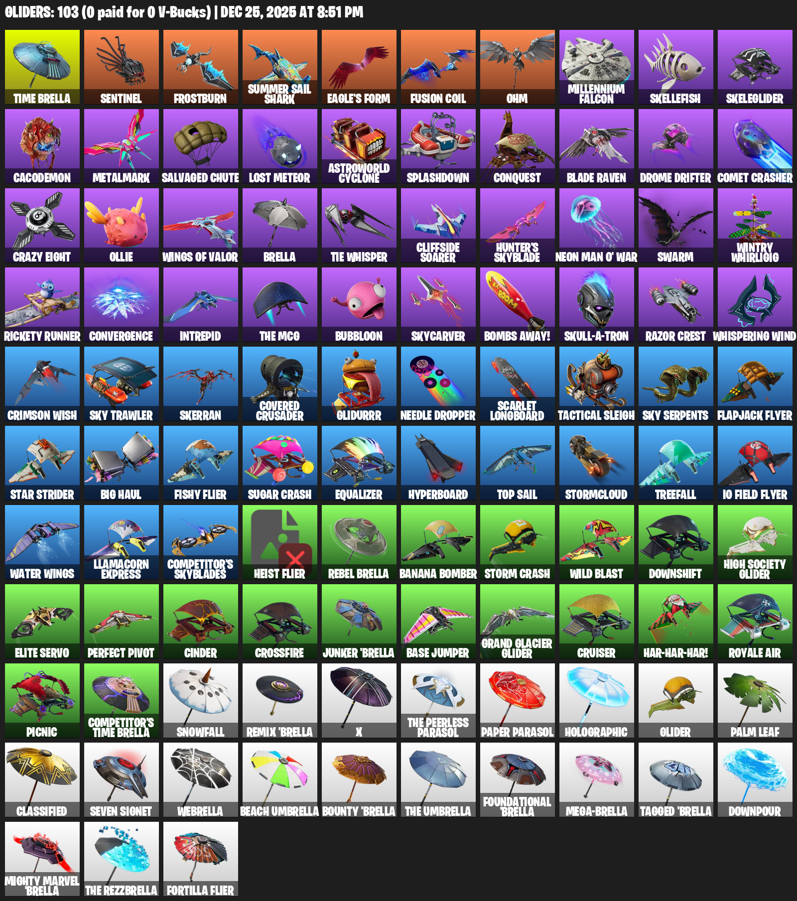 Time Brella, Sentinel, Frostburn, Summer Sail Shark, Eagle’s Form, Ohm, Millennium Falcon, Skellefish, Skeleglider, Cacodemon, Metalmark, Salvaged Chute, Lost Meteor, Astroworld Cyclone, Splashdown, Conquest, Blade Raven, Drome Drifter, Comet Crasher