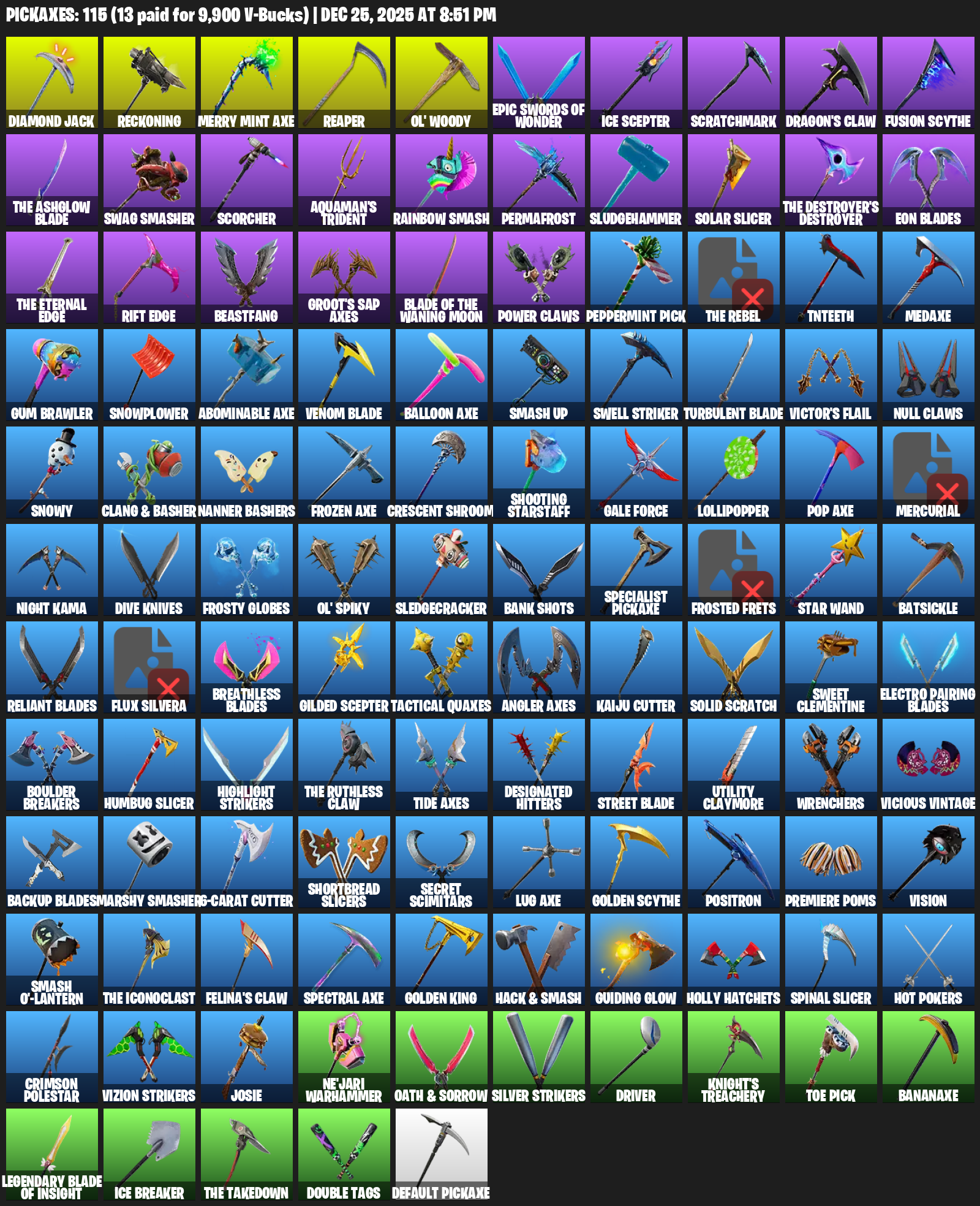 Merry Mint Axe, Diamond Jack, Reckoning, Reaper, Ol’ Woody, Scratchmark, Dragon’s Claw, Fusion Scythe, Swag Smasher, Scorcher, Aquaman’s Trident, Rainbow Smash, Permafrost, Sludgehammer, Solar Slicer, Eon Blades