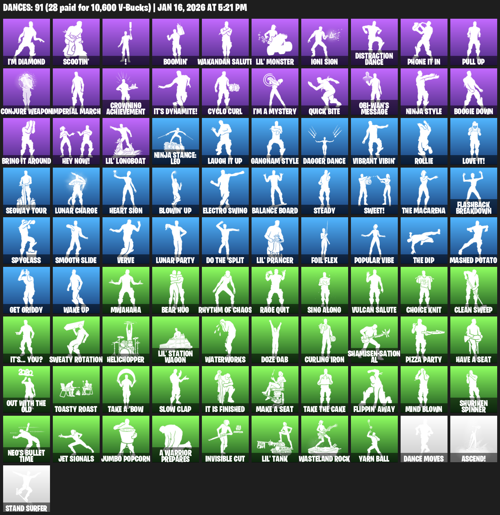 I’m Diamond, Scootin’, !, Boomin’, Wakandan Salute, Lil’ Monster, Igni Sign, Distraction Dance, Phone It In, Pull Up, Conjure Weapon, Imperial March, Crowning Achievement, It’s Dynamite!, Cyclo Curl, Quick Bite, Ninja Style, Boogie Down