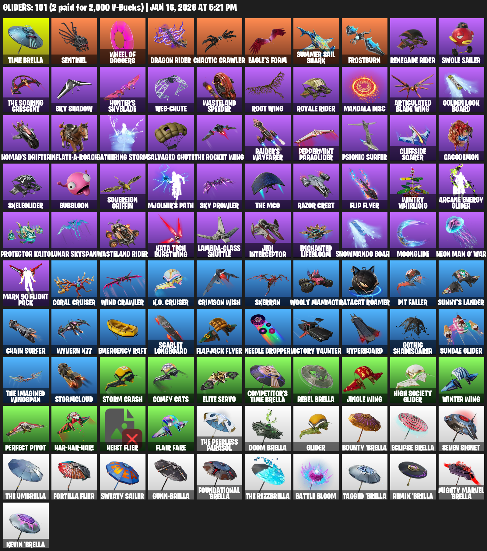 Time Brella, Sentinel, Dragon Rider, Chaotic Crawler, Eagle’s Form, Summer Sail Shark, Frostburn, Swole Sailer, Hunter’s Skyblade, Web-Chute, Wasteland Speeder, Root Wing, Mandala Disc, Golden Look Board