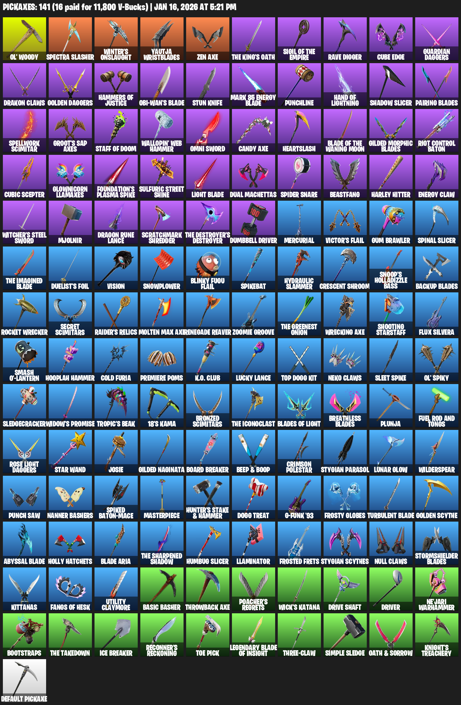 Ol’ Woody, Winter’s Onslaught, Yautja Wristblades, Zen Axe, Rave Digger, Cube Edge, Guardian Daggers, Drakon Claws, Hammers of Justice, Obi-Wan’s Blade, Stun Knife, Punchline, Shadow Slicer, Pairing Blades