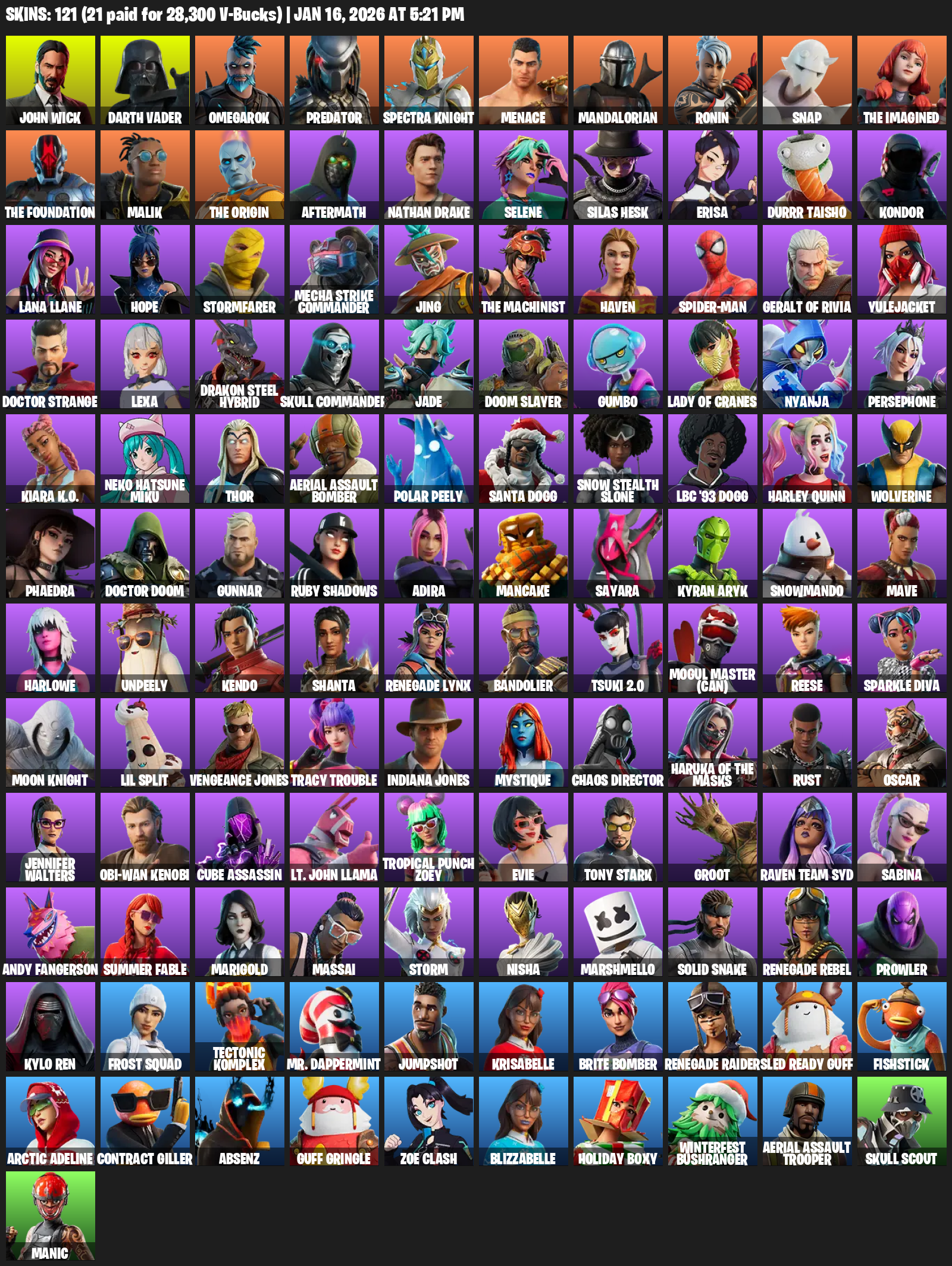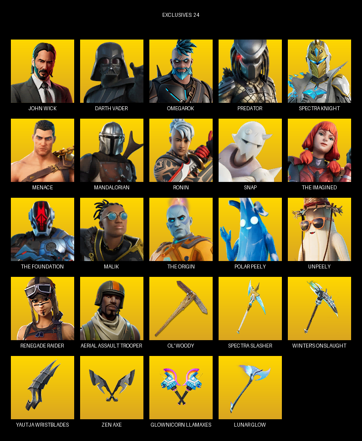 Renegade Raider, Aerial Assault Trooper, John Wick, Darth Vader, Omegarok, Predator, Spectra Knight, Menace, Mandalorian, Ronin, Snap, The Imagined, Malik, Aftermath, Nathan Drake, Selene, Silas Hesk, Erisa