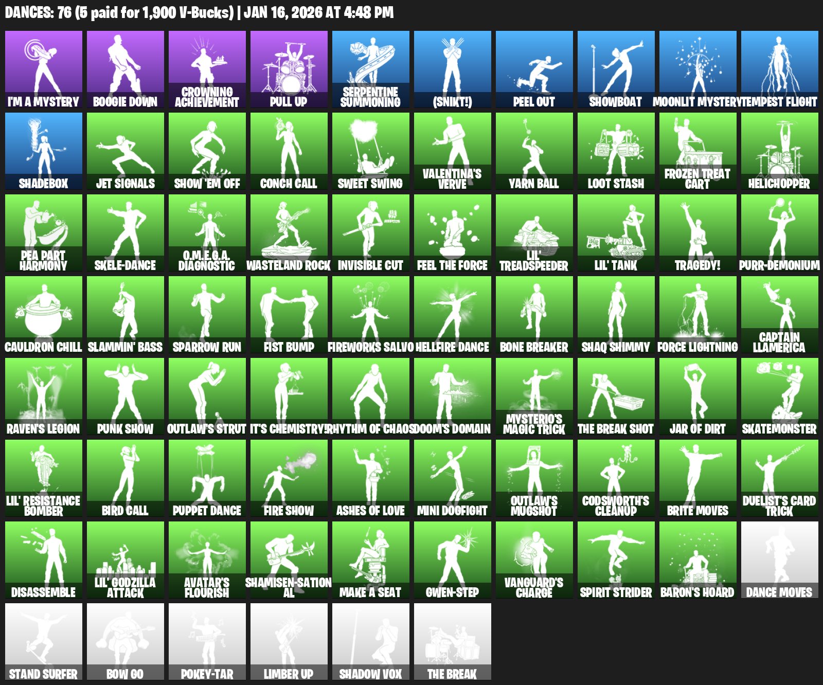 I’m a Mystery, Boogie Down, Crowning Achievement, Pull Up, Serpentine Summoning, (Snikt!), Peel Out, Showboat, Tempest Flight, Shadebox, Jet Signals, Show ‘Em Off, Conch Call, Sweet Swing, Valentina’s Verve, Yarn Ball, Loot Stash, Frozen Treat Cart, Helichopper