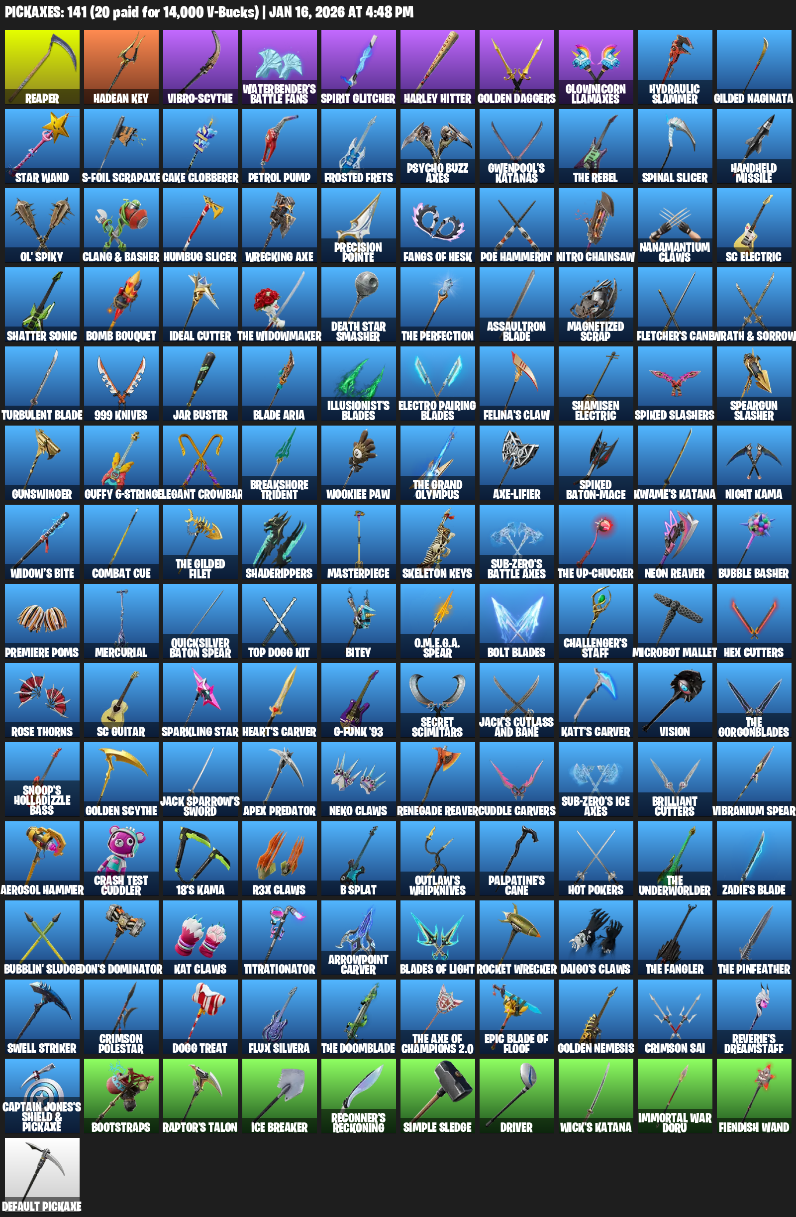 Reaper, Hadean Key, Vibro-scythe, Waterbender’s Battle Fans, Harley Hitter, Golden Daggers, Glownicorn Llamaxes, Hydraulic Slammer, Gilded Naginata, Star Wand, S-Foil Scrapaxe, Cake Clobberer, Petrol Pump, Frosted Frets, Gwenpool’s Katanas, The Rebel, Spinal Slicer, Handheld Missile