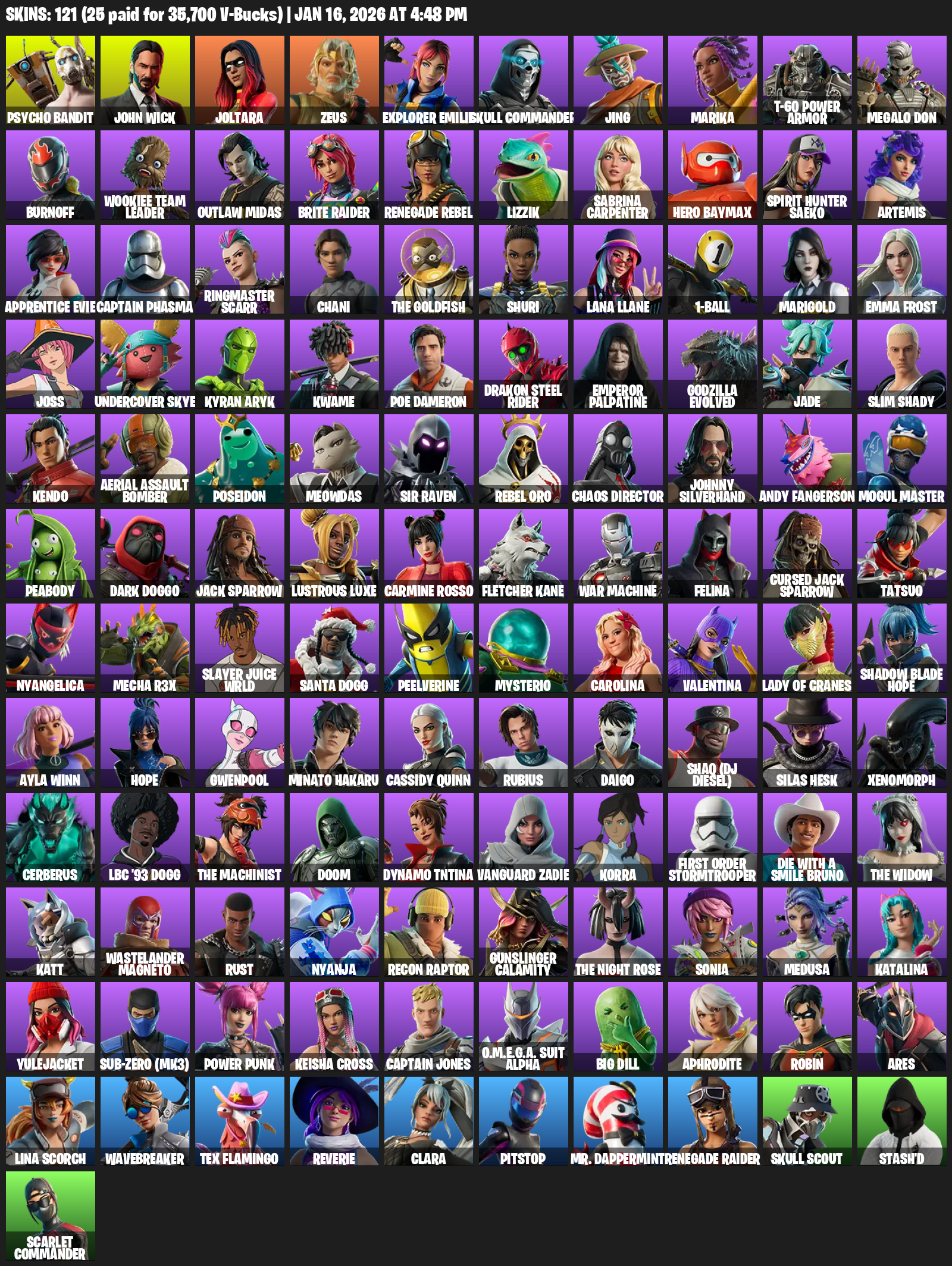 Renegade Raider, Psycho Bandit, John Wick, Joltara, Zeus, Explorer Emilie, Skull Commander, Jing, Marika, T-60 Power Armor, Megalo Don, Burnoff, Wookiee Team Leader, Outlaw Midas, Lizzik, Sabrina Carpenter, Hero Baymax, Spirit Hunter Saeko