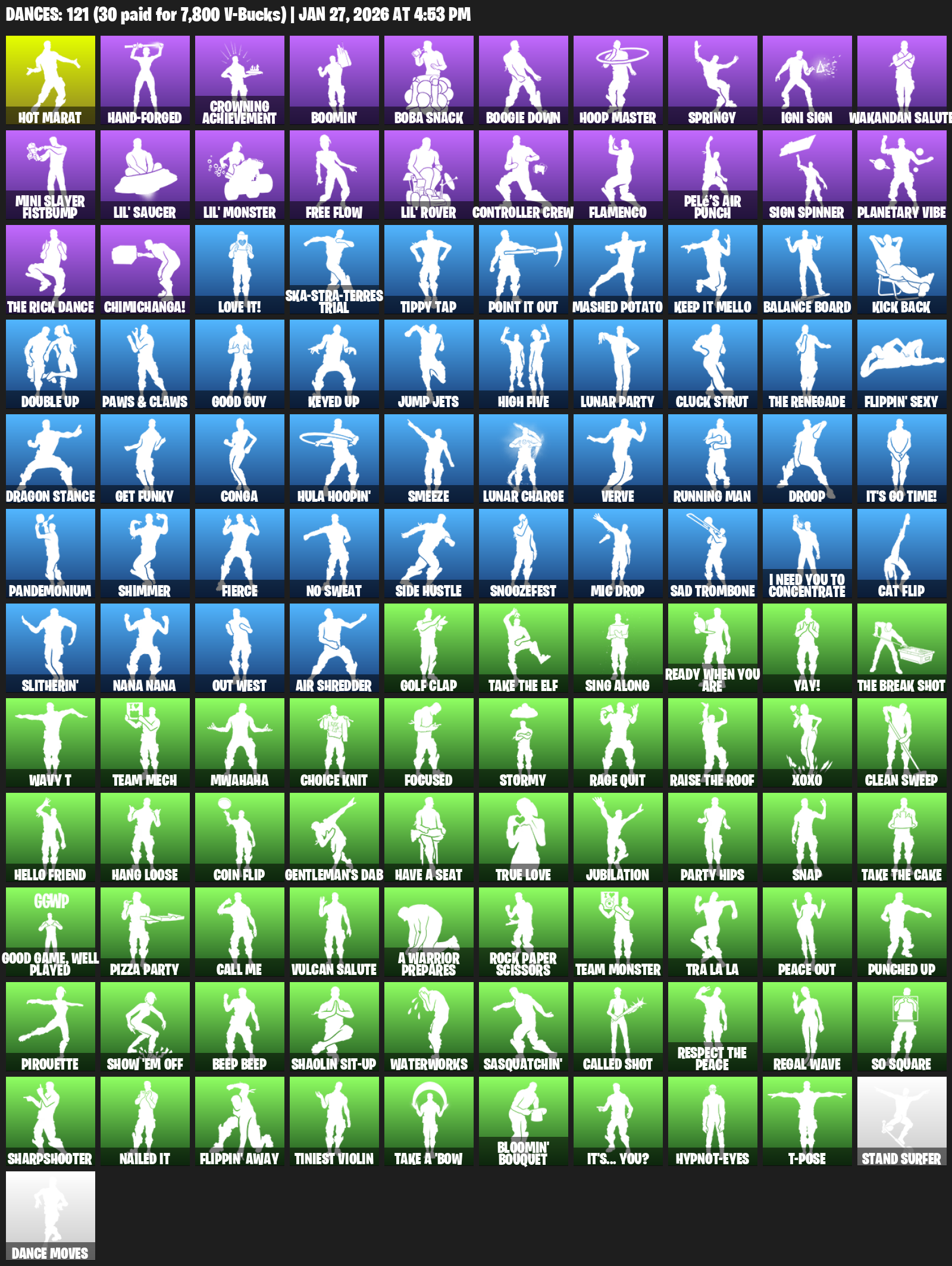 Hot Marat, Crowning Achievement, Boomin’, Boba Snack, Boogie Down, Hoop Master, Springy, Igni Sign, Wakandan Salute, Mini Slayer Fistbump, Lil’ Saucer, Free Flow, Controller Crew, Flamenco, Pelé’s Air Punch, Planetary Vibe