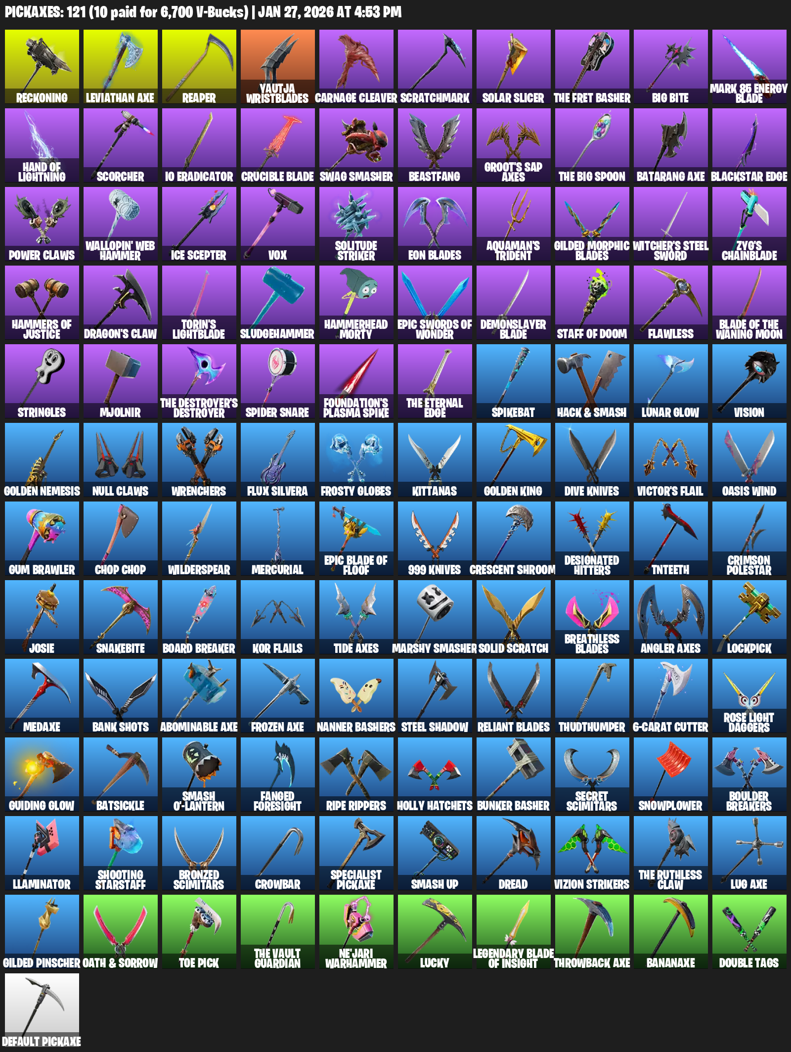 Leviathan Axe, Reckoning, Reaper, Yautja Wristblades, Carnage Cleaver, Scratchmark, Solar Slicer, Big Bite, Mark 85 Energy Blade, Hand of Lightning, Scorcher, IO Eradicator, Swag Smasher, Beastfang, Groot’s Sap Axes, Blackstar Edge