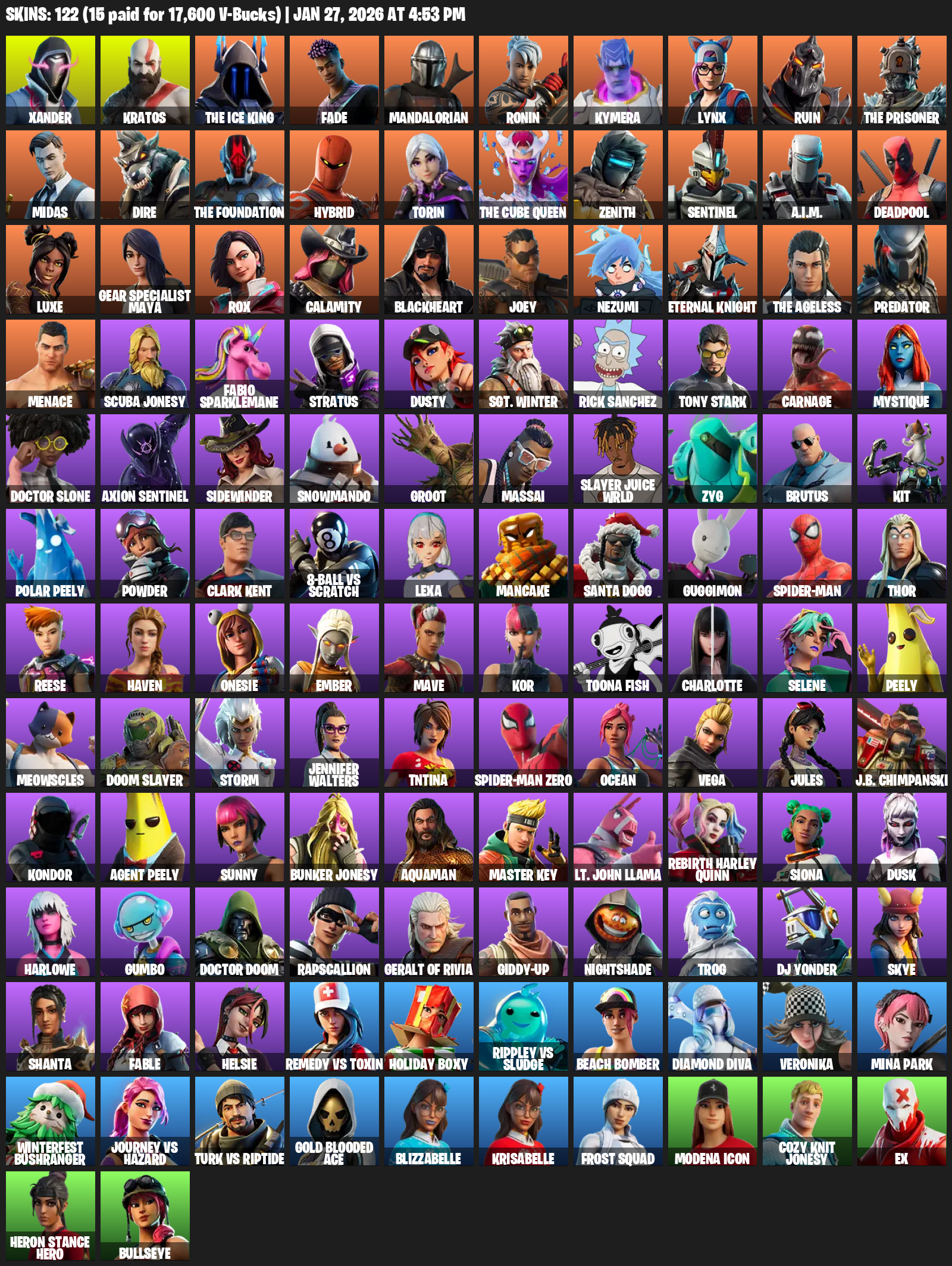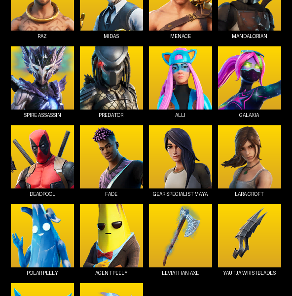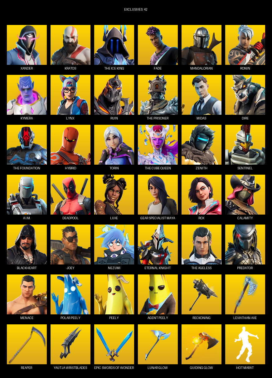 Gear Specialist Maya, Xander, Kratos, The Ice King, Fade, Mandalorian, Ronin, Kymera, Lynx, Ruin, Midas, Dire, Hybrid, Torin, Zenith, Sentinel, A.I.M.