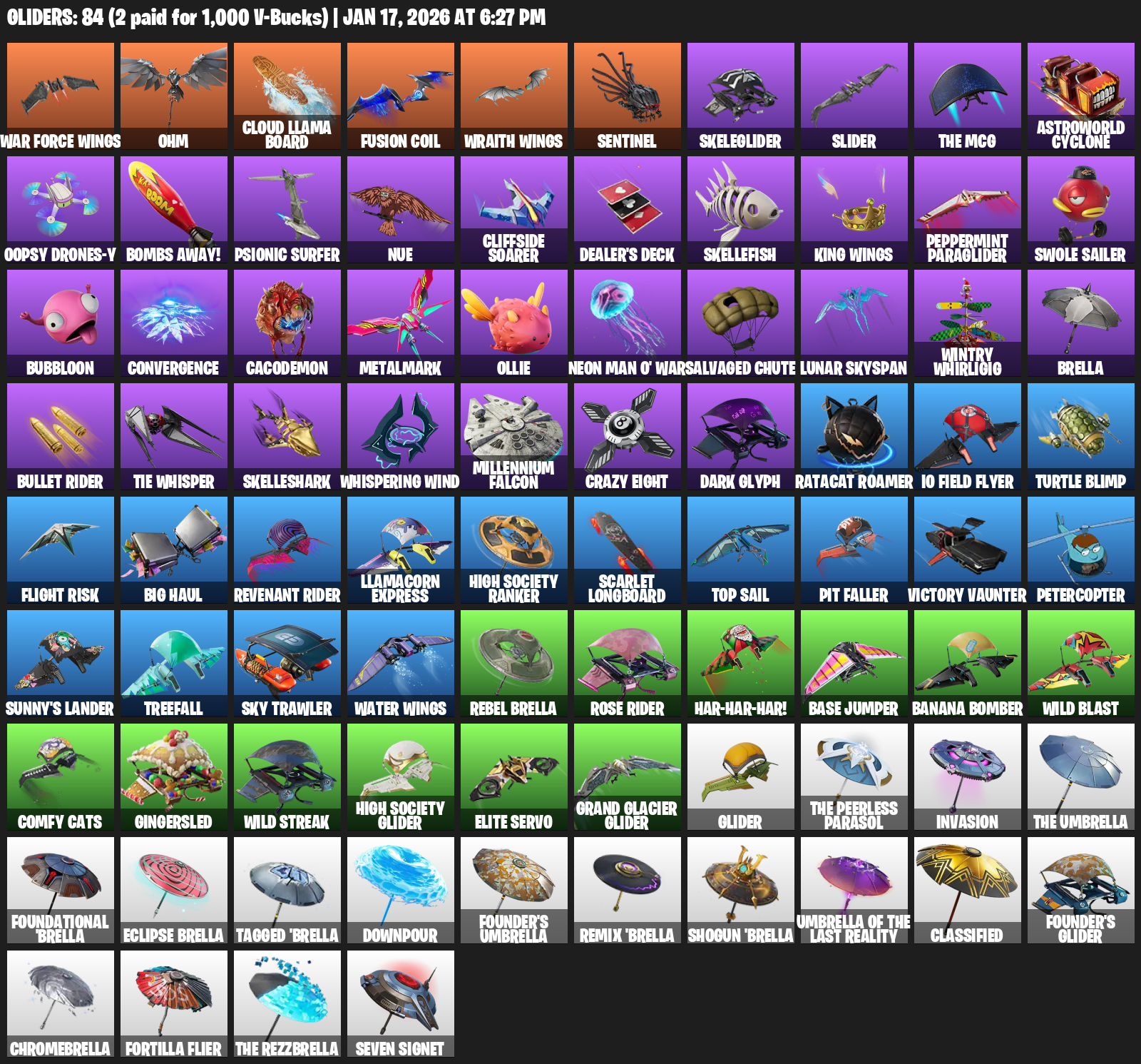 War Force Wings, Ohm, Cloud Llama Board, Sentinel, Skeleglider, Slider, Astroworld Cyclone, Oopsy Drones-y, Bombs Away!, Psionic Surfer, Nue, Cliffside Soarer, Dealer’s Deck, Skellefish, Peppermint Paraglider, Swole Sailer