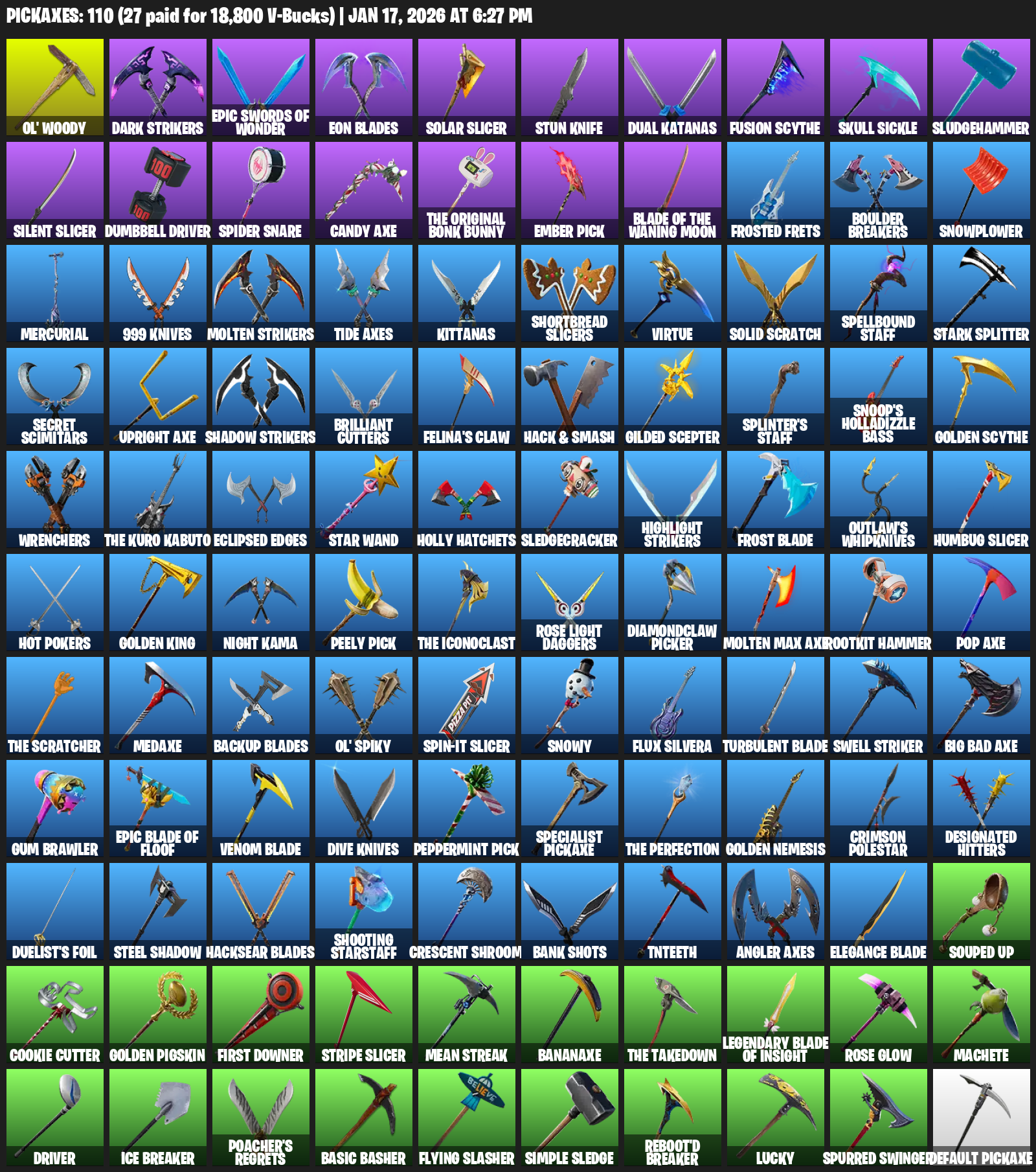Ol’ Woody, Eon Blades, Solar Slicer, Stun Knife, Dual Katanas, Skull Sickle, Sludgehammer, Dumbbell Driver, Spider Snare, Candy Axe, The Original Bonk Bunny, Ember Pick, Frosted Frets, Boulder Breakers, Snowplower