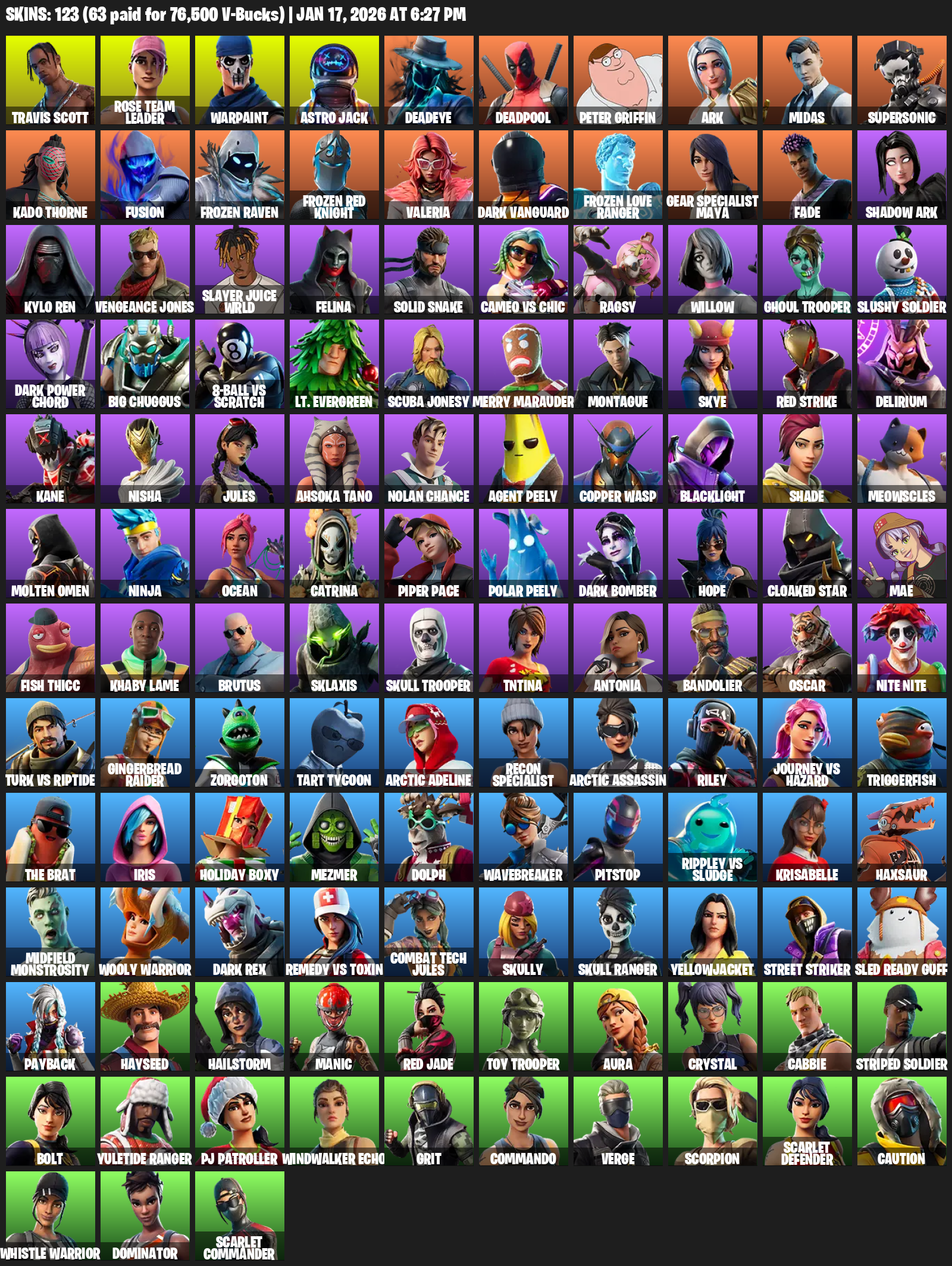 Travis Scott, Gear Specialist Maya, Rose Team Leader, Warpaint, Astro Jack, Deadeye, Deadpool, Peter Griffin, Ark, Midas, Supersonic, Kado Thorne, Fusion, Frozen Raven, Valeria, Dark Vanguard, Fade