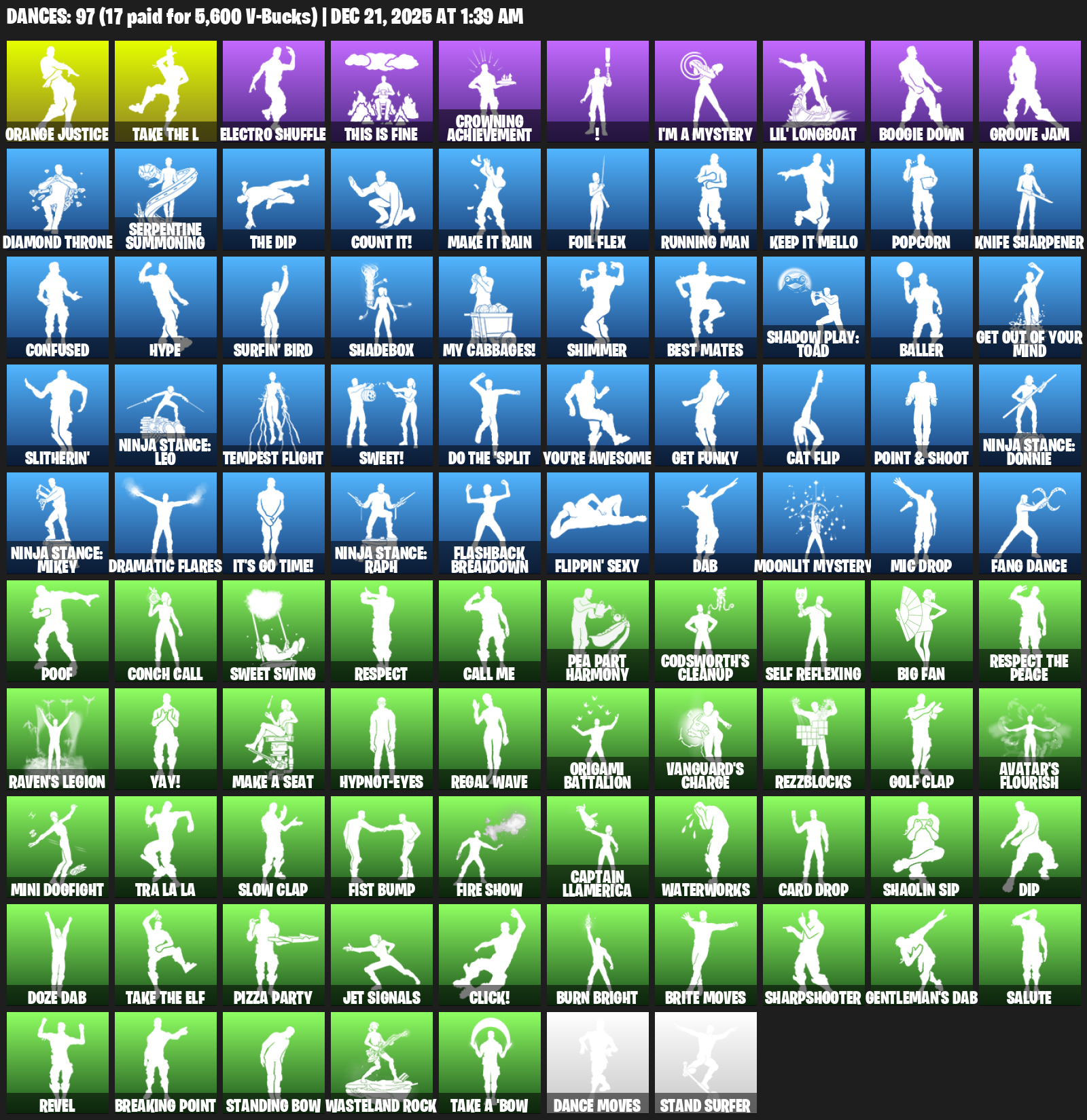 Orange Justice, Electro Shuffle, This is Fine, Crowning Achievement, !, I’m a Mystery, Lil’ Longboat, Boogie Down, Groove Jam, Diamond Throne, Serpentine Summoning, Count It!, Make It Rain, Foil Flex, Running Man, Popcorn