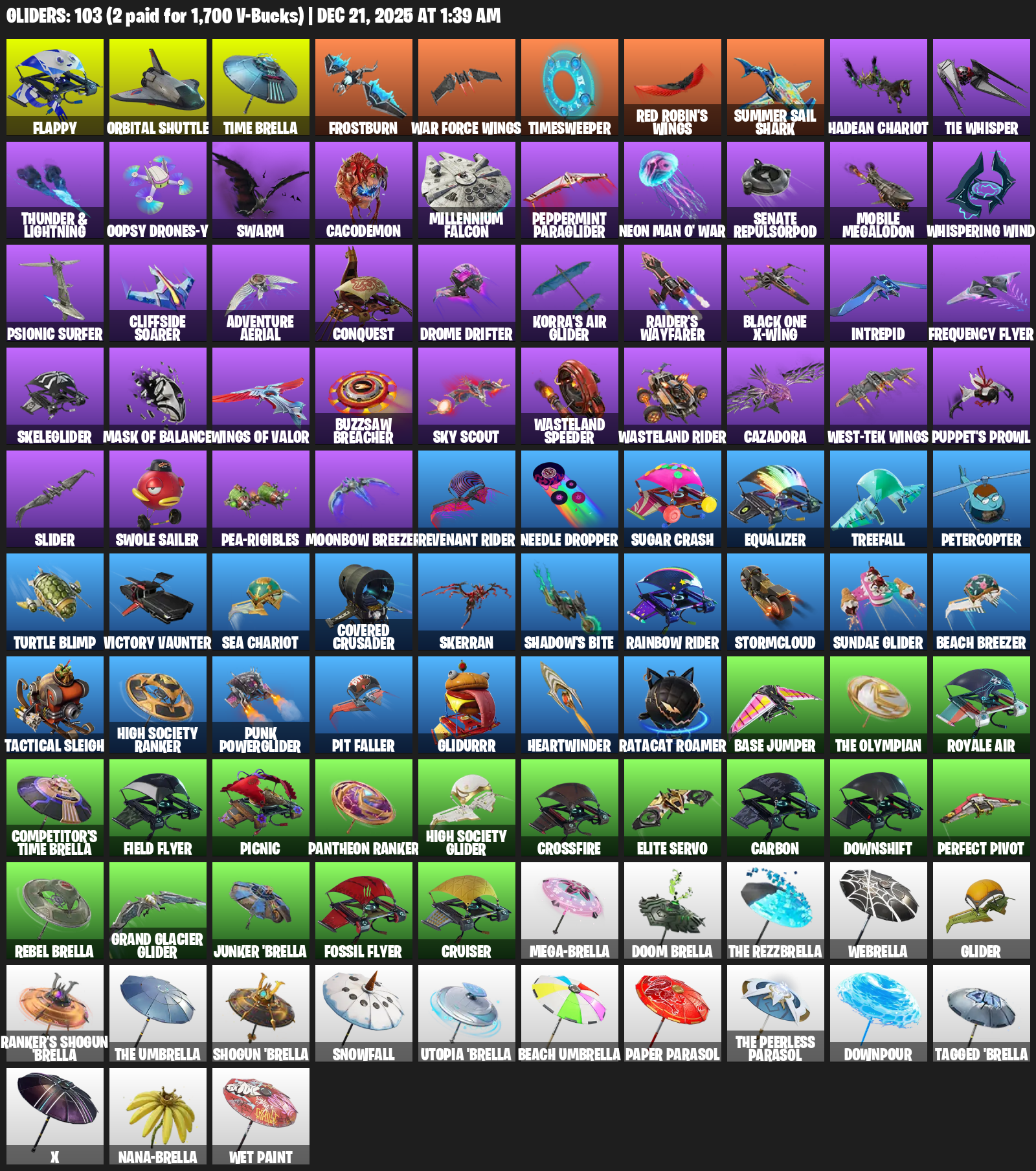 Flappy, Orbital Shuttle, Time Brella, Frostburn, War Force Wings, Timesweeper, Summer Sail Shark, TIE Whisper, Thunder & Lightning, Oopsy Drones-y, Swarm, Cacodemon, Millennium Falcon, Peppermint Paraglider, Senate Repulsorpod, Mobile Megalodon, Whispering Wind