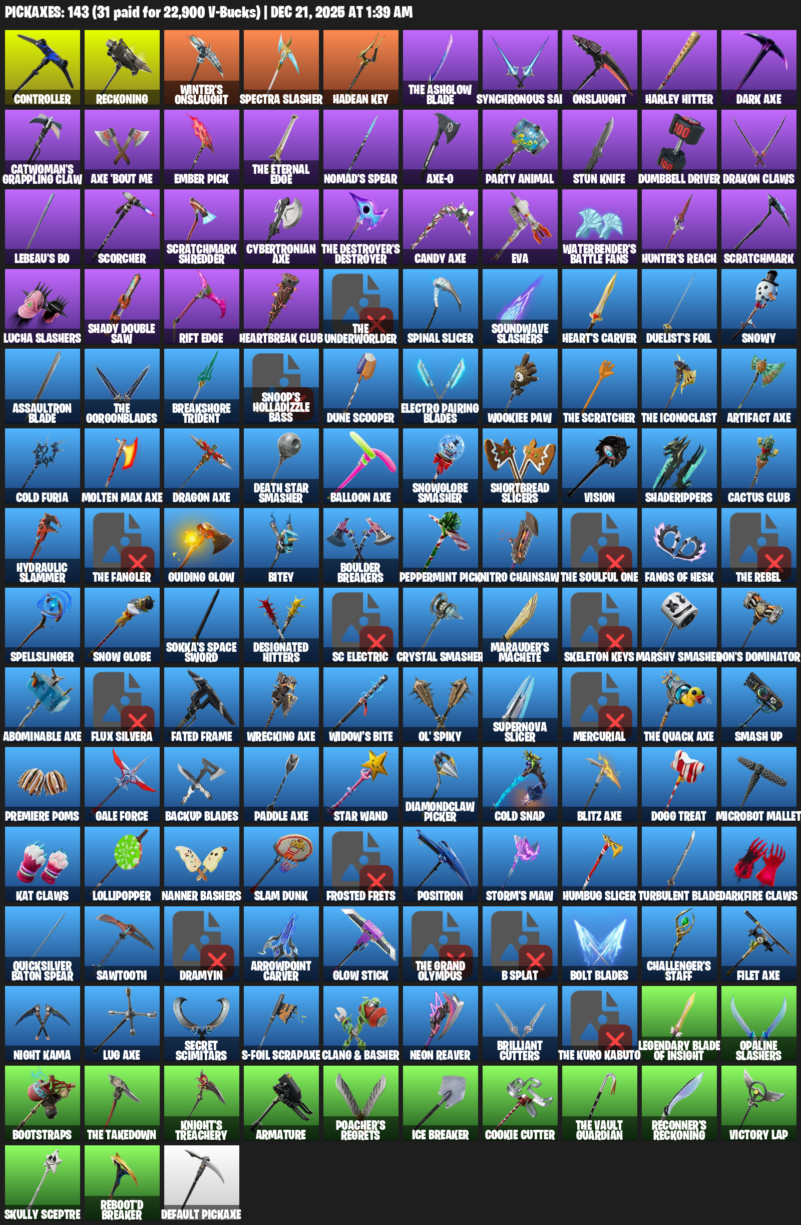 Controller, Reckoning, Winter’s Onslaught, Hadean Key, The Ashglow Blade, Synchronous Sai, Harley Hitter, Dark Axe, Catwoman’s Grappling Claw, Ember Pick, Nomad’s Spear, Party Animal, Stun Knife, Dumbbell Driver, Drakon Claws