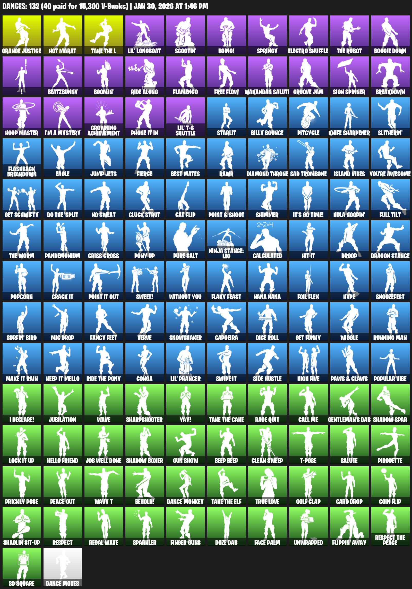 Hot Marat, Orange Justice, Lil’ Longboat, Scootin’, Boing!, Springy, Electro Shuffle, Boogie Down, !, BeatzBunny, Boomin’, Ride Along, Flamenco, Free Flow, Wakandan Salute, Groove Jam, Sign Spinner, Breakdown