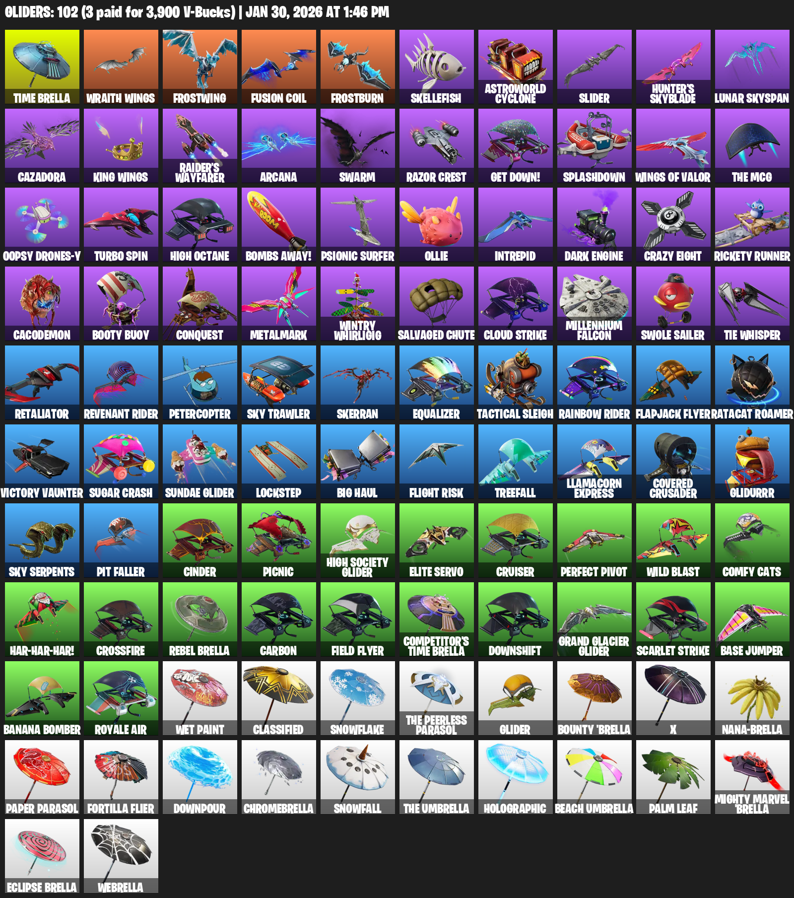 Time Brella, Wraith Wings, Frostwing, Fusion Coil, Frostburn, Skellefish, Astroworld Cyclone, Slider, Hunter’s Skyblade, Lunar Skyspan, Cazadora, Raider’s Wayfarer, Arcana, Swarm, Razor Crest, Get Down!, Splashdown