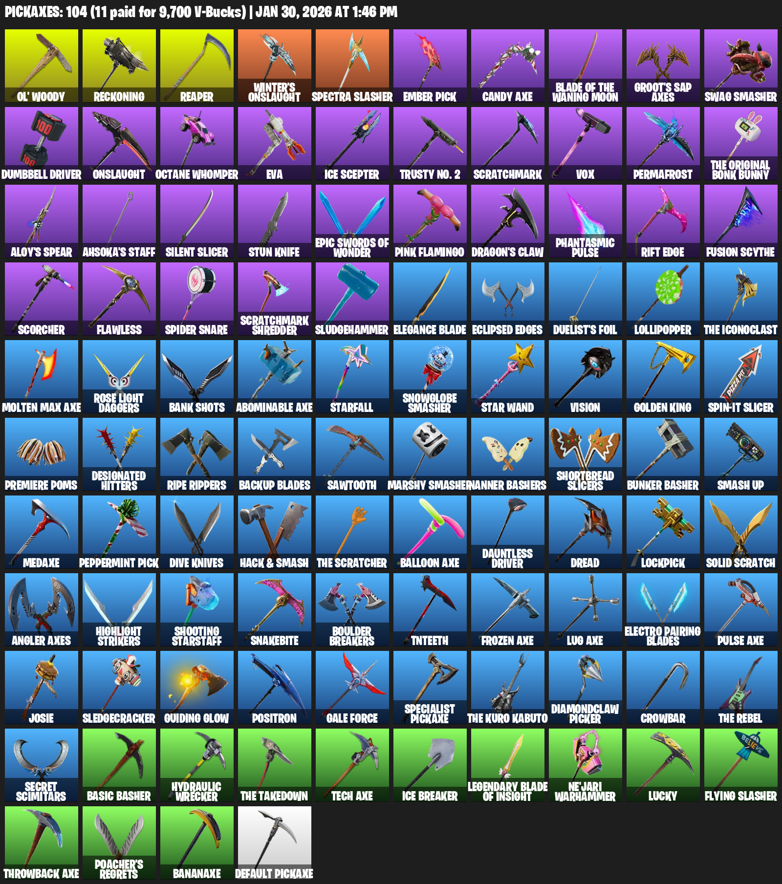 Ol’ Woody, Reckoning, Winter’s Onslaught, Spectra Slasher, Ember Pick, Candy Axe, Groot’s Sap Axes, Swag Smasher, Dumbbell Driver, Octane Whomper, EVA, Ice Scepter, Trusty No. 2, Scratchmark, Vox, Permafrost