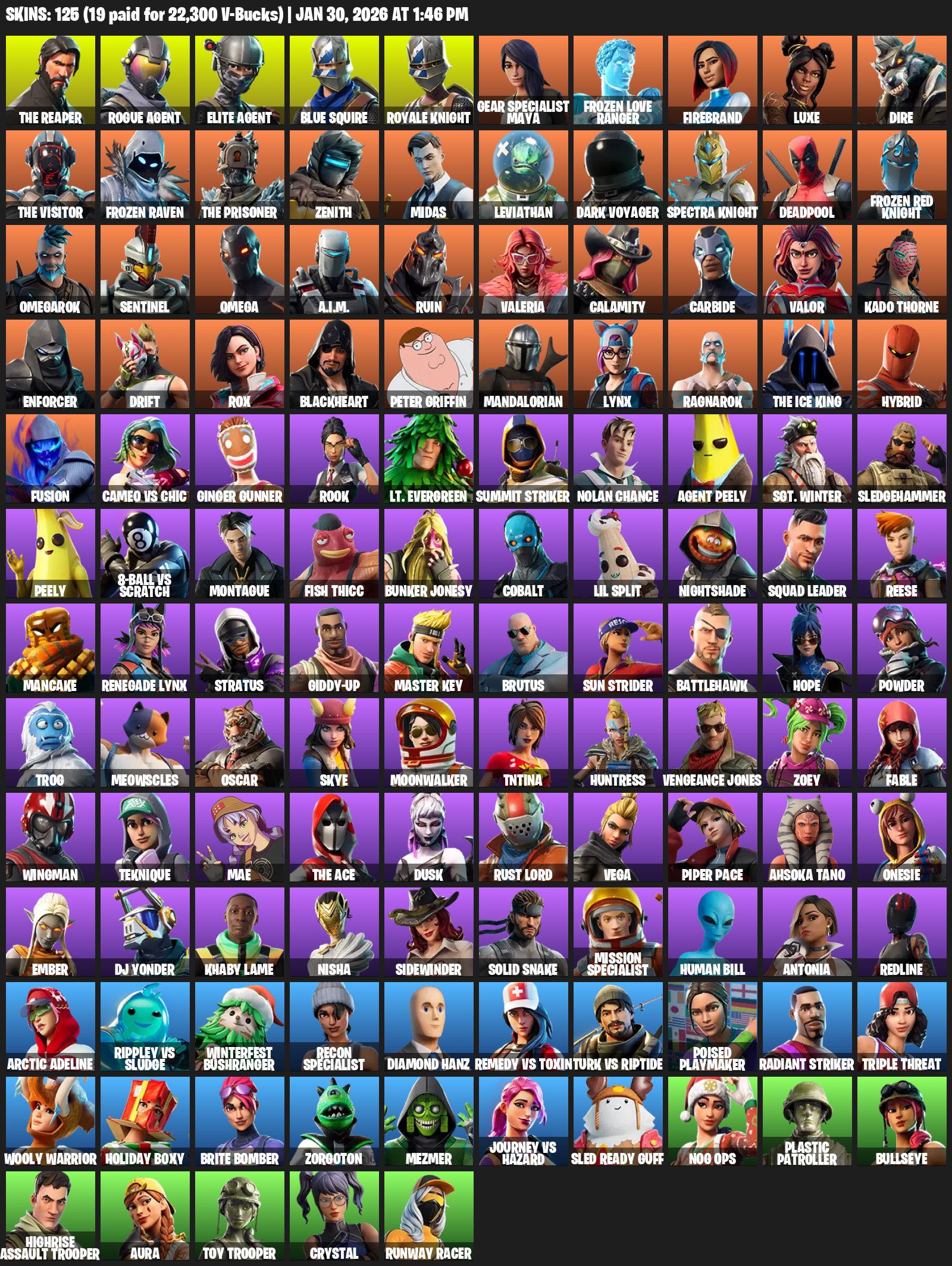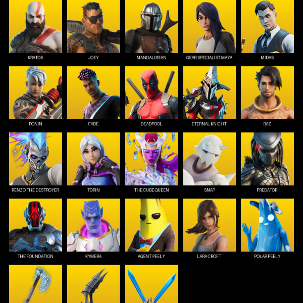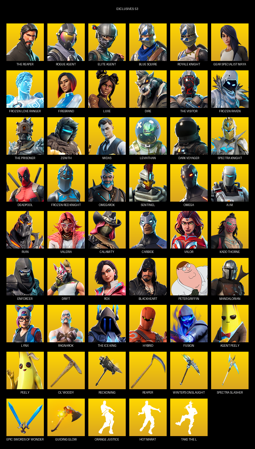 The Reaper, Elite Agent, Blue Squire, Royale Knight, Gear Specialist Maya, Omega, Frozen Love Ranger, Firebrand, Luxe, Dire, Zenith, Midas, Leviathan, Dark Voyager, Deadpool