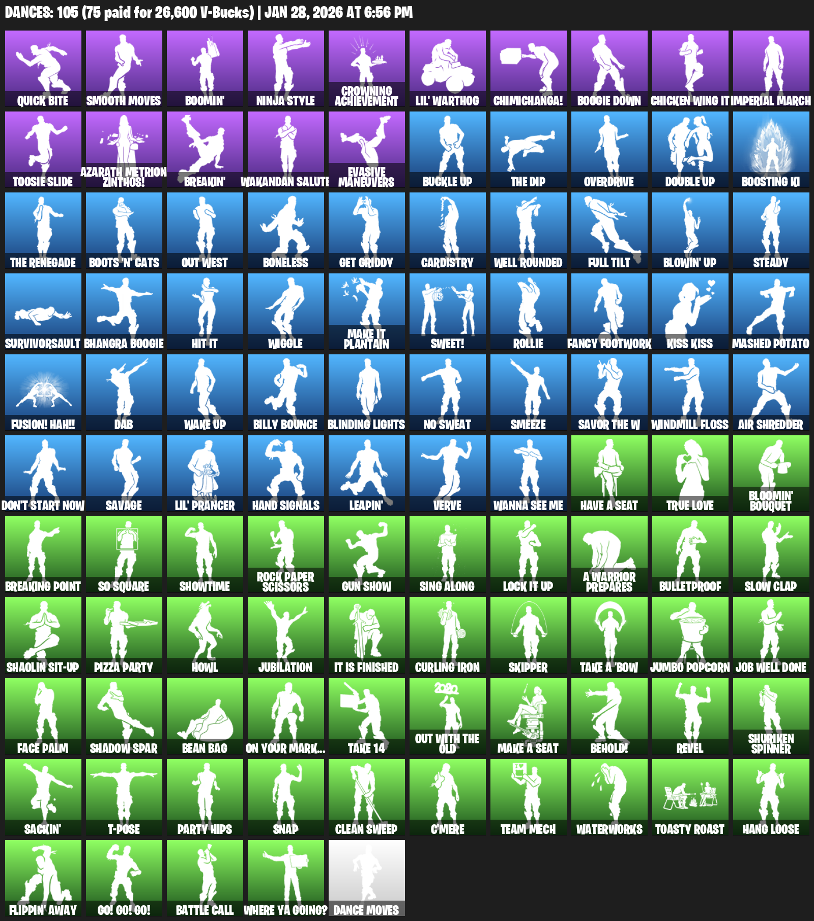 Quick Bite, Smooth Moves, Boomin’, Ninja Style, Crowning Achievement, Lil’ Warthog, Chimichanga!, Boogie Down, Chicken Wing It, Imperial March, Toosie Slide, Azarath Metrion Zinthos!, Breakin’, Wakandan Salute, Evasive Maneuvers, Buckle Up, Overdrive, Boosting Ki