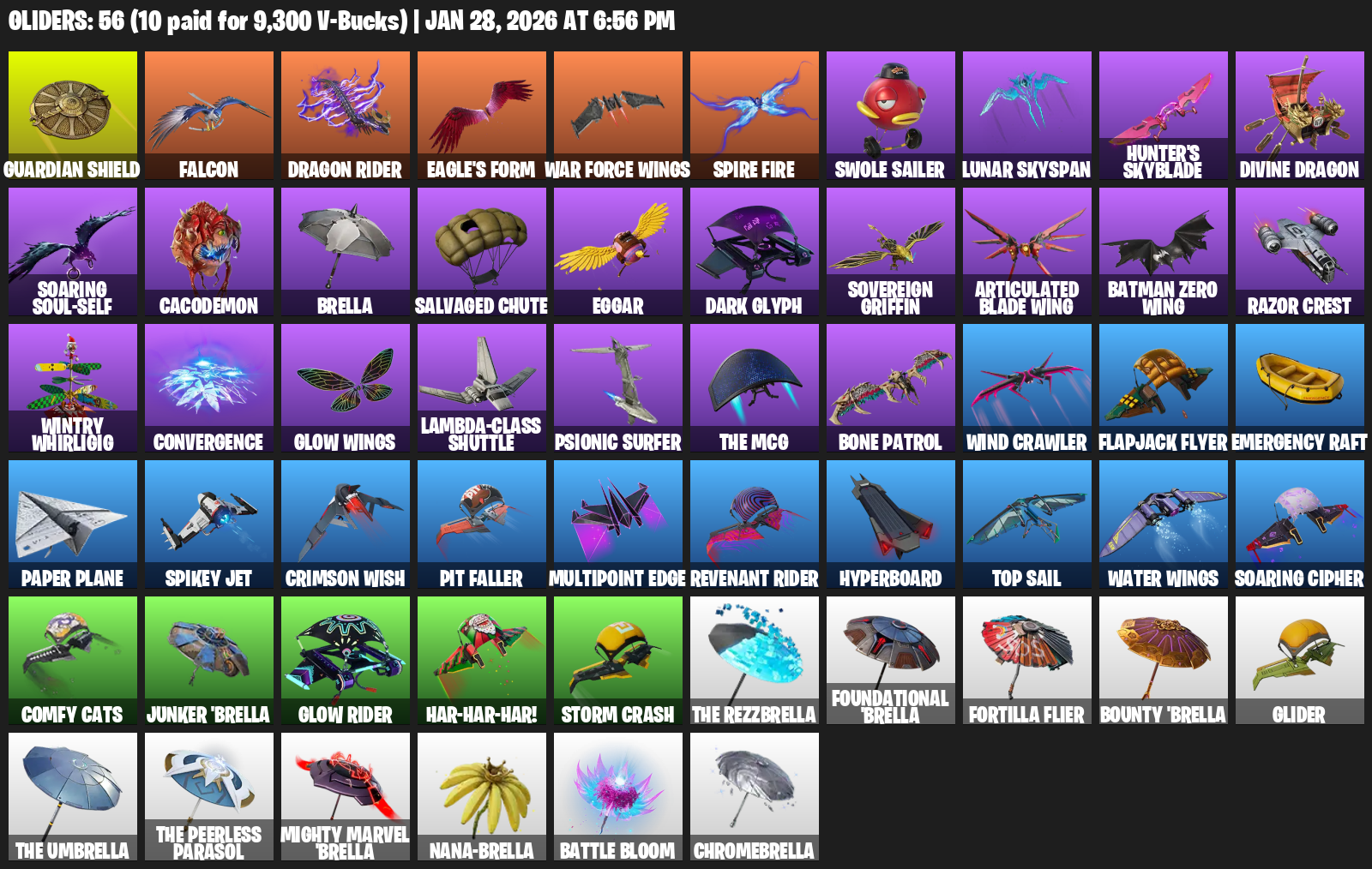 Guardian Shield, Falcon, Eagle’s Form, Swole Sailer, Lunar Skyspan, Hunter’s Skyblade, Soaring Soul-Self, Cacodemon, Brella, Salvaged Chute, Eggar, Dark Glyph, Sovereign Griffin, Razor Crest