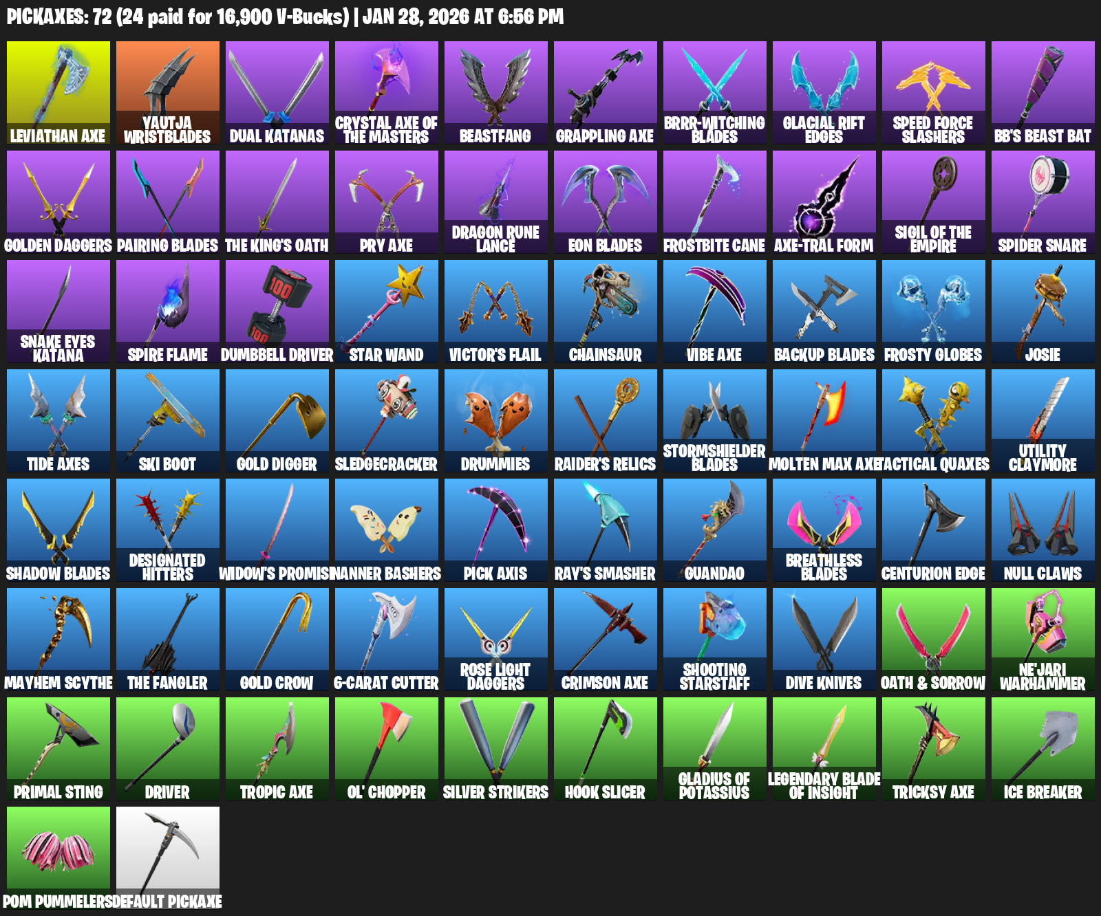 Leviathan Axe, Yautja Wristblades, Dual Katanas, Beastfang, Brrr-witching Blades, Glacial Rift Edges, Speed Force Slashers, BB’s Beast Bat, Golden Daggers, The King’s Oath, Dragon Rune Lance, Frostbite Cane, Spider Snare