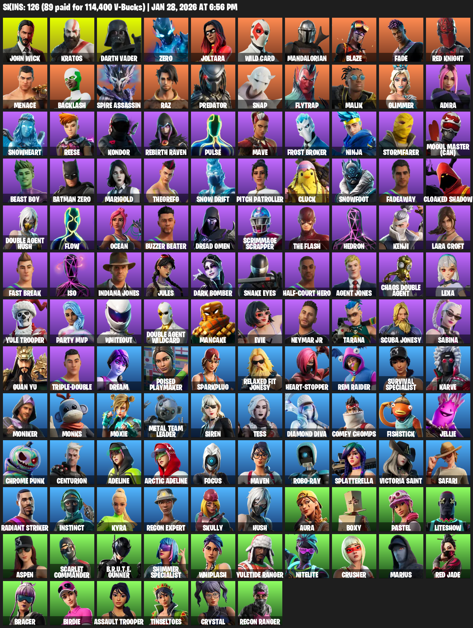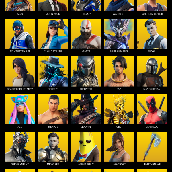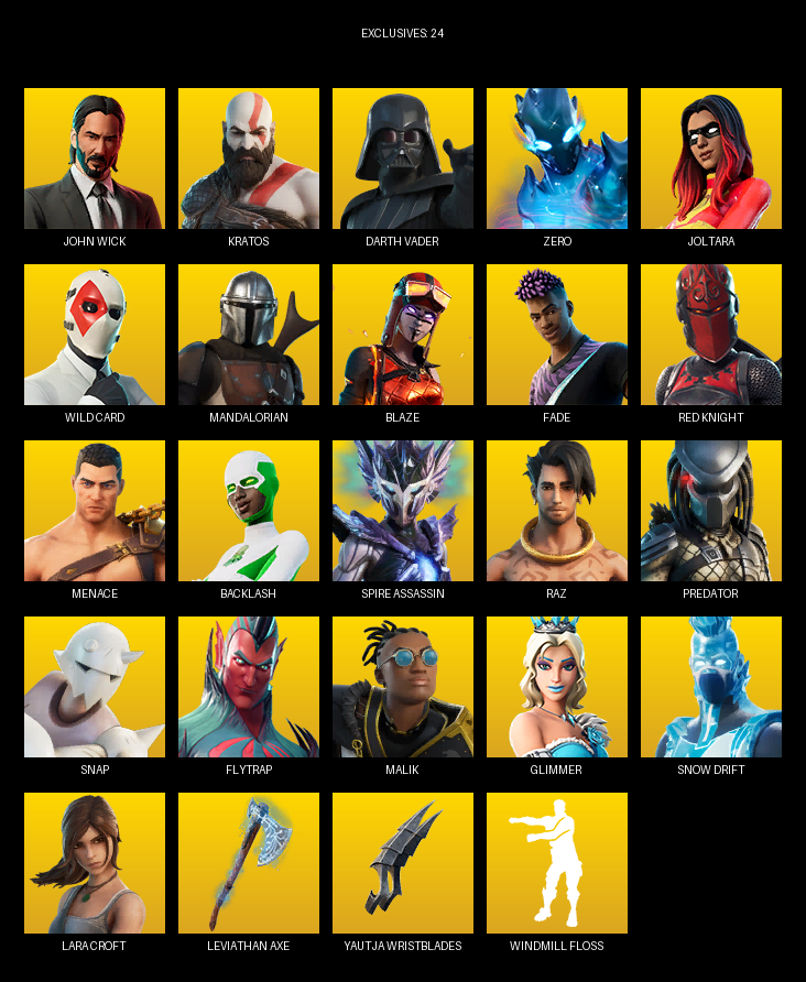 Lara Croft, John Wick, Kratos, Darth Vader, Zero, Joltara, Wild Card, Mandalorian, Blaze, Fade, Red Knight, Menace, Backlash, Spire Assassin, Raz, Predator, Snap, Flytrap, Malik, Glimmer