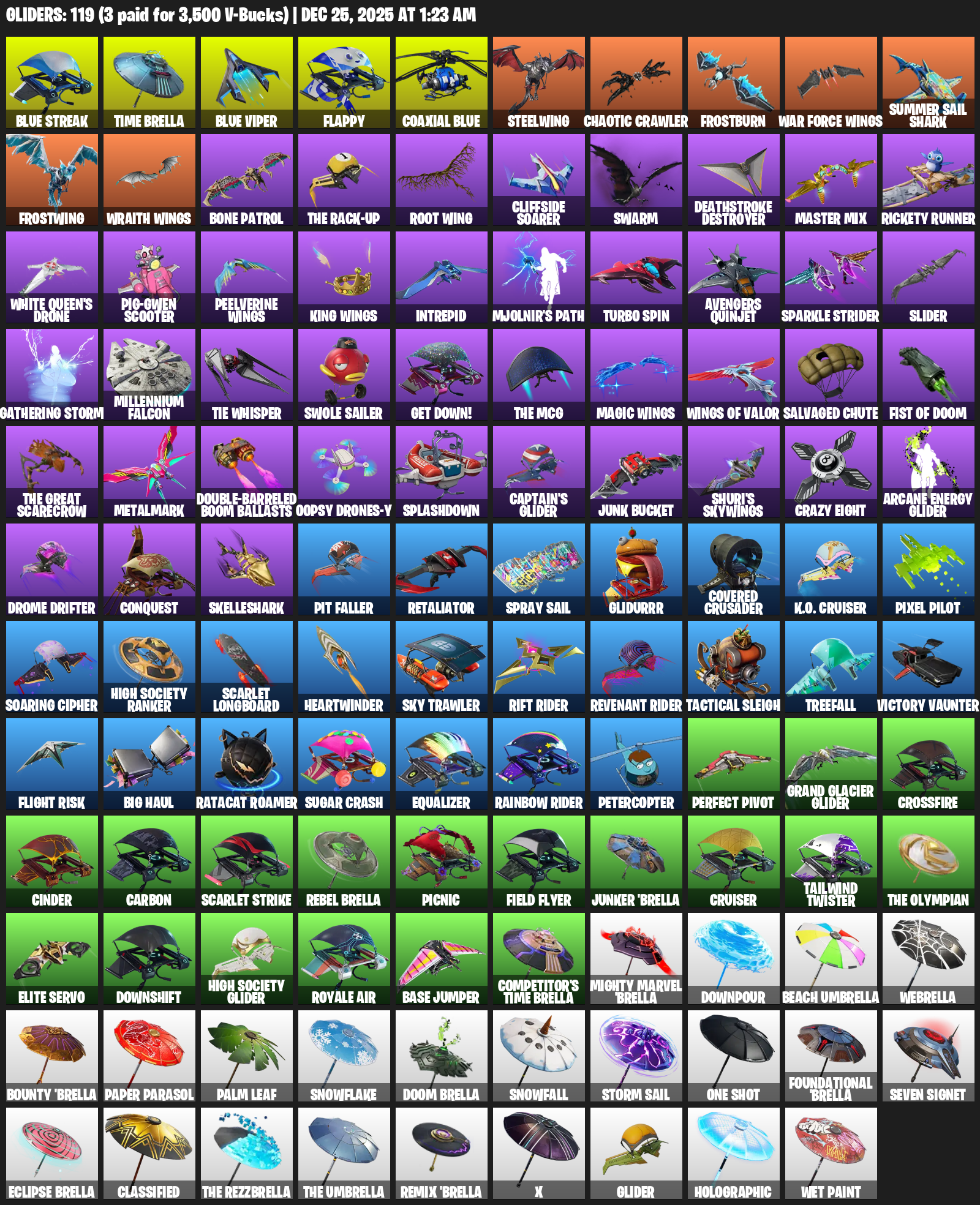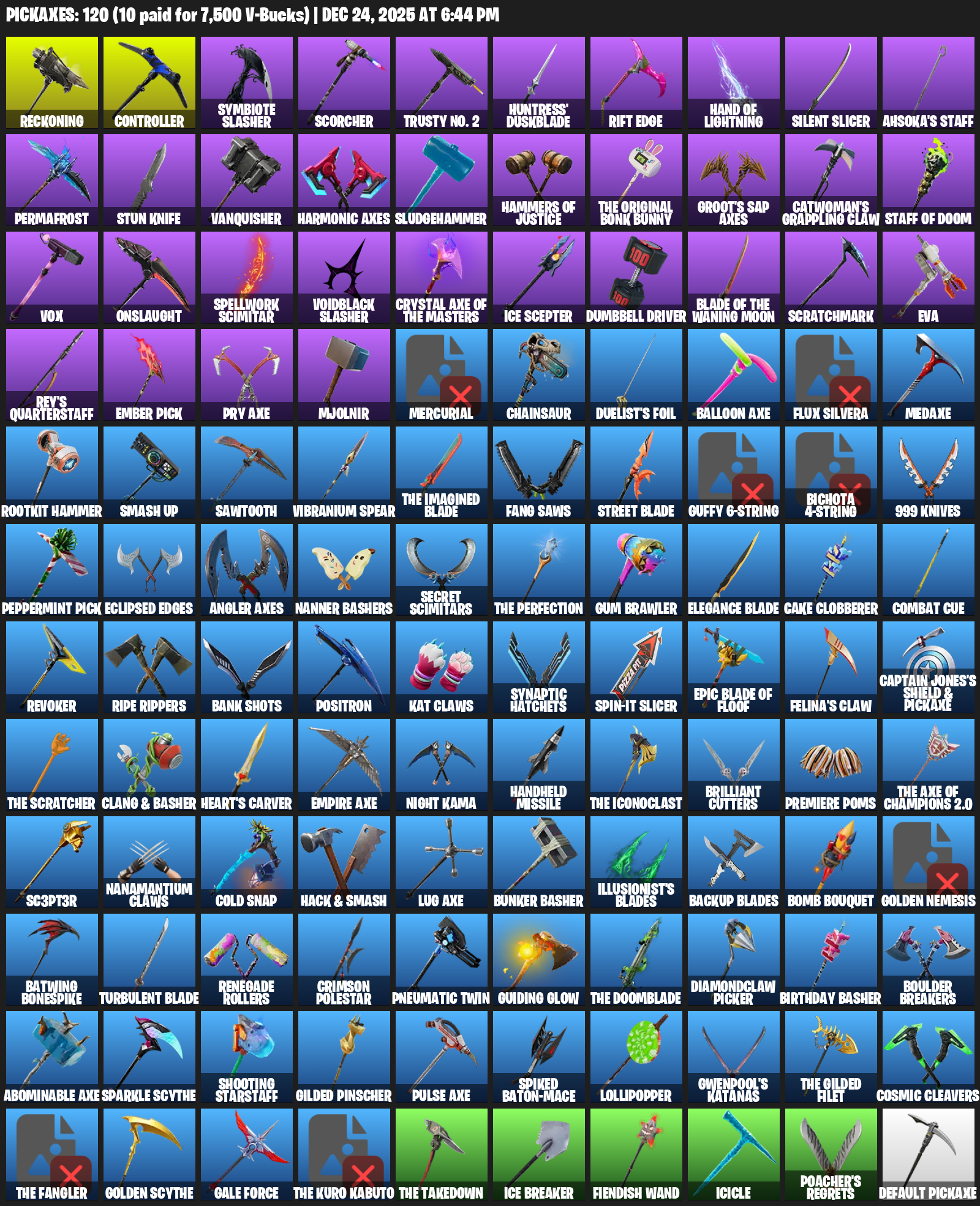 Reckoning, Controller, Symbiote Slasher, Scorcher, Trusty No. 2, Huntress’ Duskblade, Rift Edge, Hand of Lightning, Silent Slicer, Ahsoka’s Staff, Permafrost, Stun Knife, Vanquisher, Harmonic Axes, Sludgehammer, The Original Bonk Bunny, Catwoman’s Grappling Claw