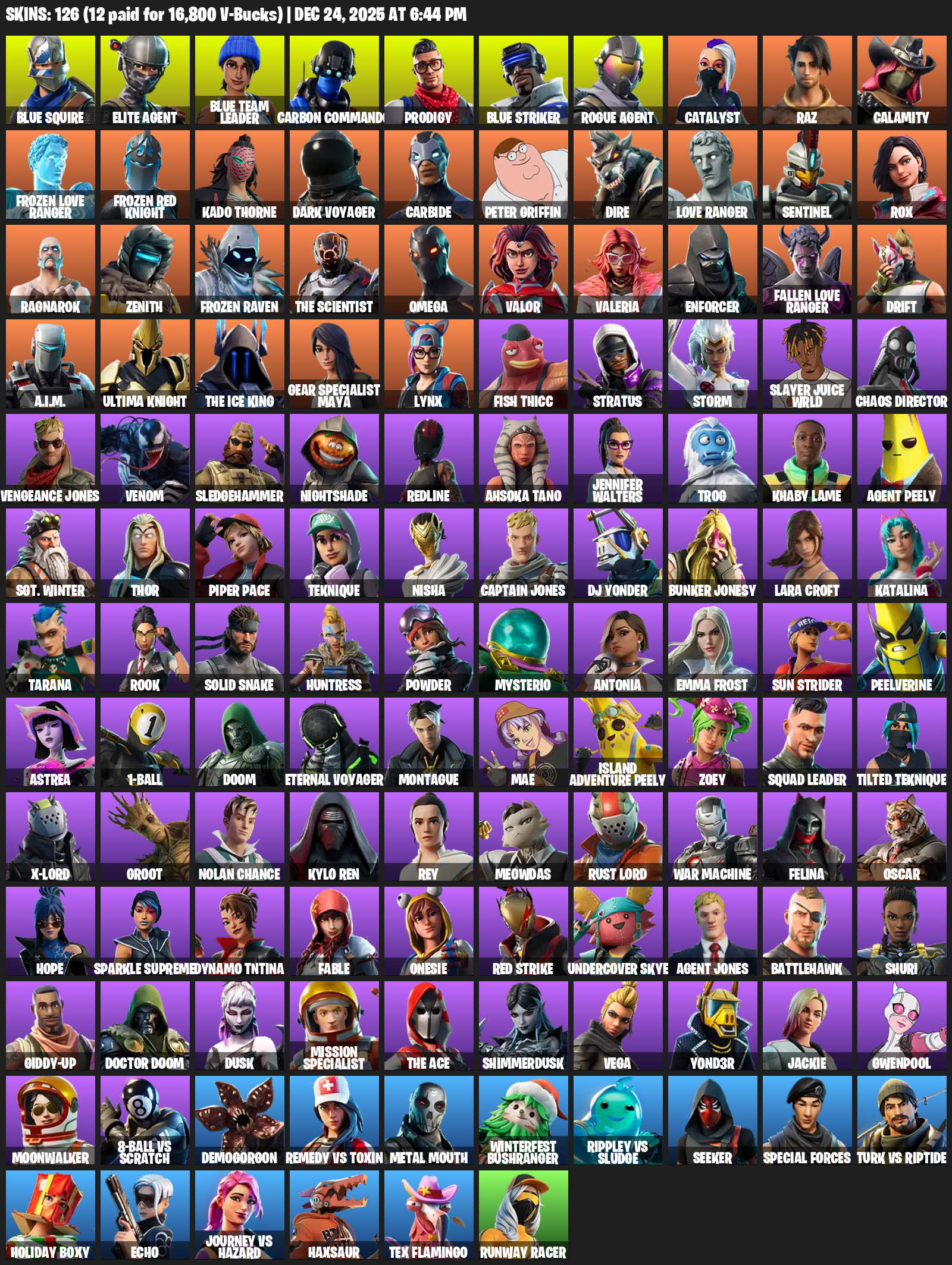 Blue Squire, Elite Agent, Omega, Gear Specialist Maya, Lara Croft, Carbon Commando, Prodigy, Catalyst, Raz, Calamity, Frozen Love Ranger, Kado Thorne, Dark Voyager, Carbide, Peter Griffin, Dire