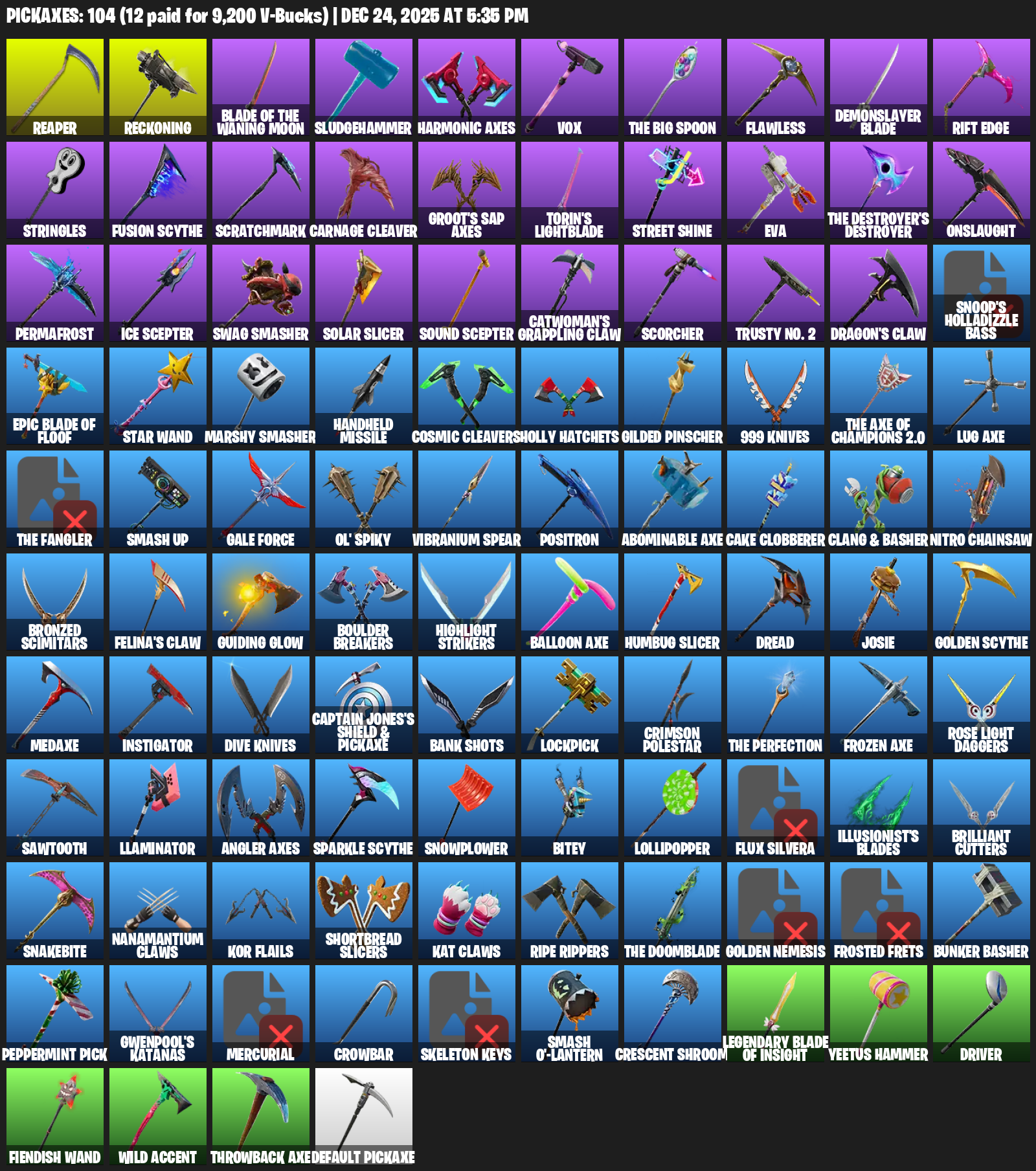 Reckoning, Sludgehammer, Harmonic Axes, Vox, Flawless, Demonslayer Blade, Rift Edge, Stringles, Scratchmark, Carnage Cleaver, Torin’s Lightblade, Street Shine, EVA, Onslaught