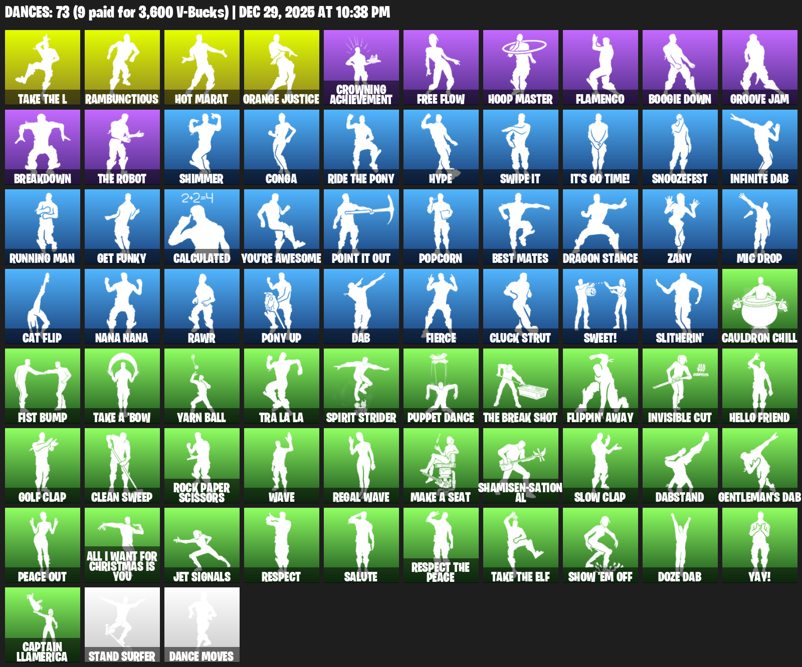 Hot Marat, Rambunctious, Orange Justice, Crowning Achievement, Free Flow, Hoop Master, Flamenco, Boogie Down, Groove Jam, Breakdown, Shimmer, Conga, Hype, Swipe It, It’s Go Time!, Snoozefest, Infinite Dab