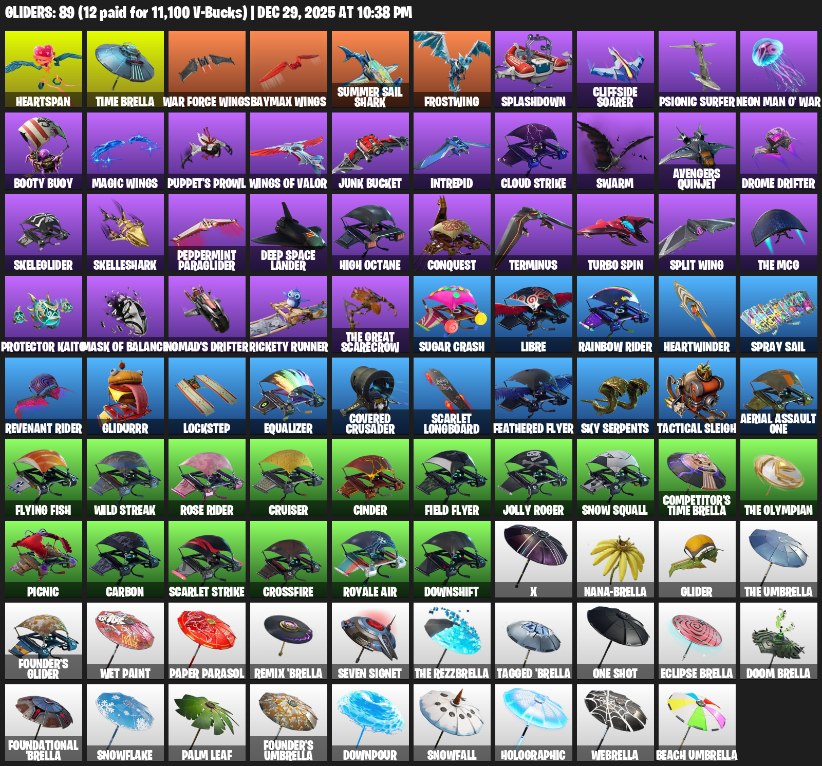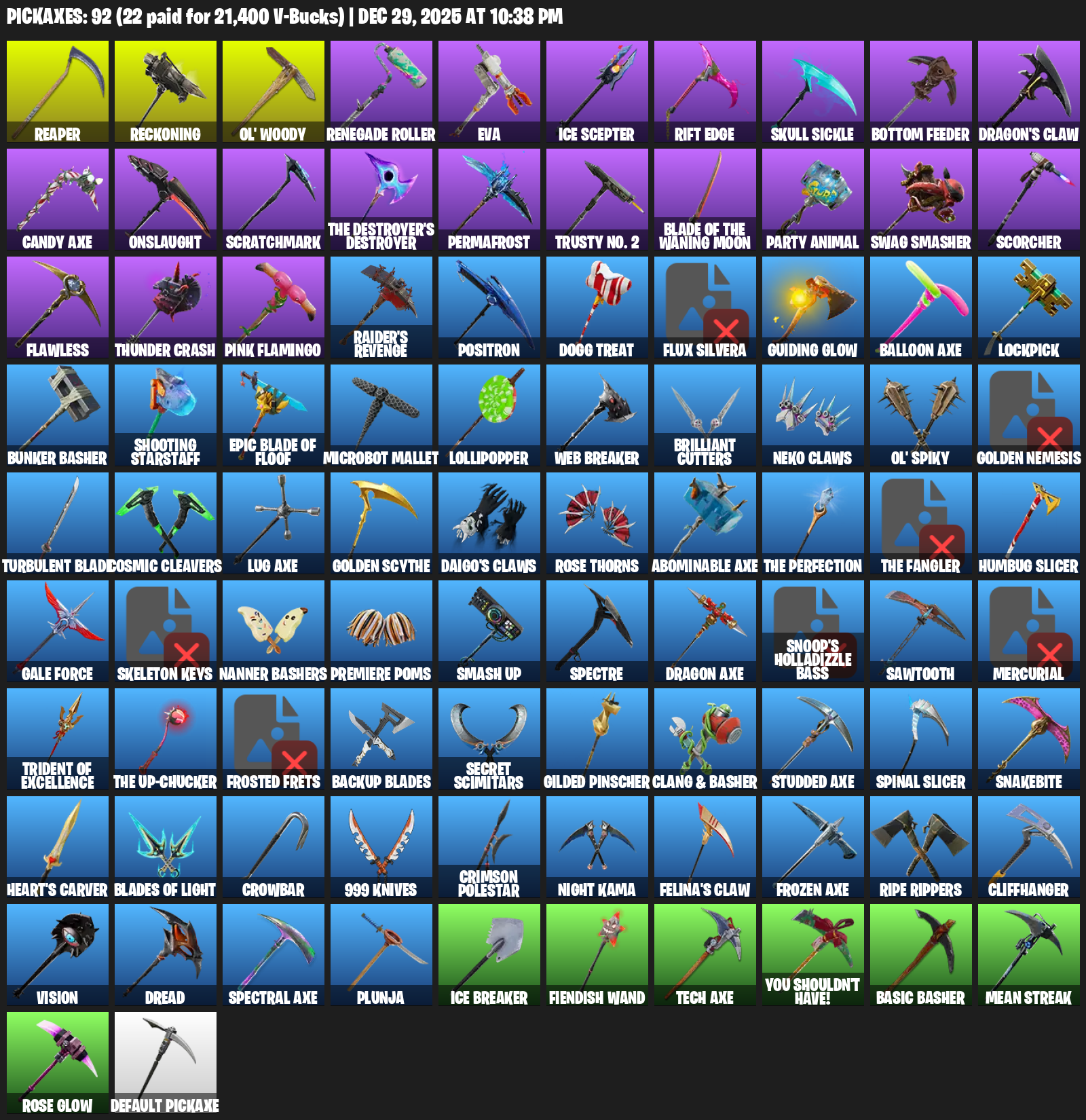 Raider’s Revenge, Reckoning, Ol’ Woody, EVA, Ice Scepter, Rift Edge, Skull Sickle, Bottom Feeder, Dragon’s Claw, Candy Axe, Onslaught, Scratchmark, Permafrost, Trusty No. 2, Party Animal, Swag Smasher
