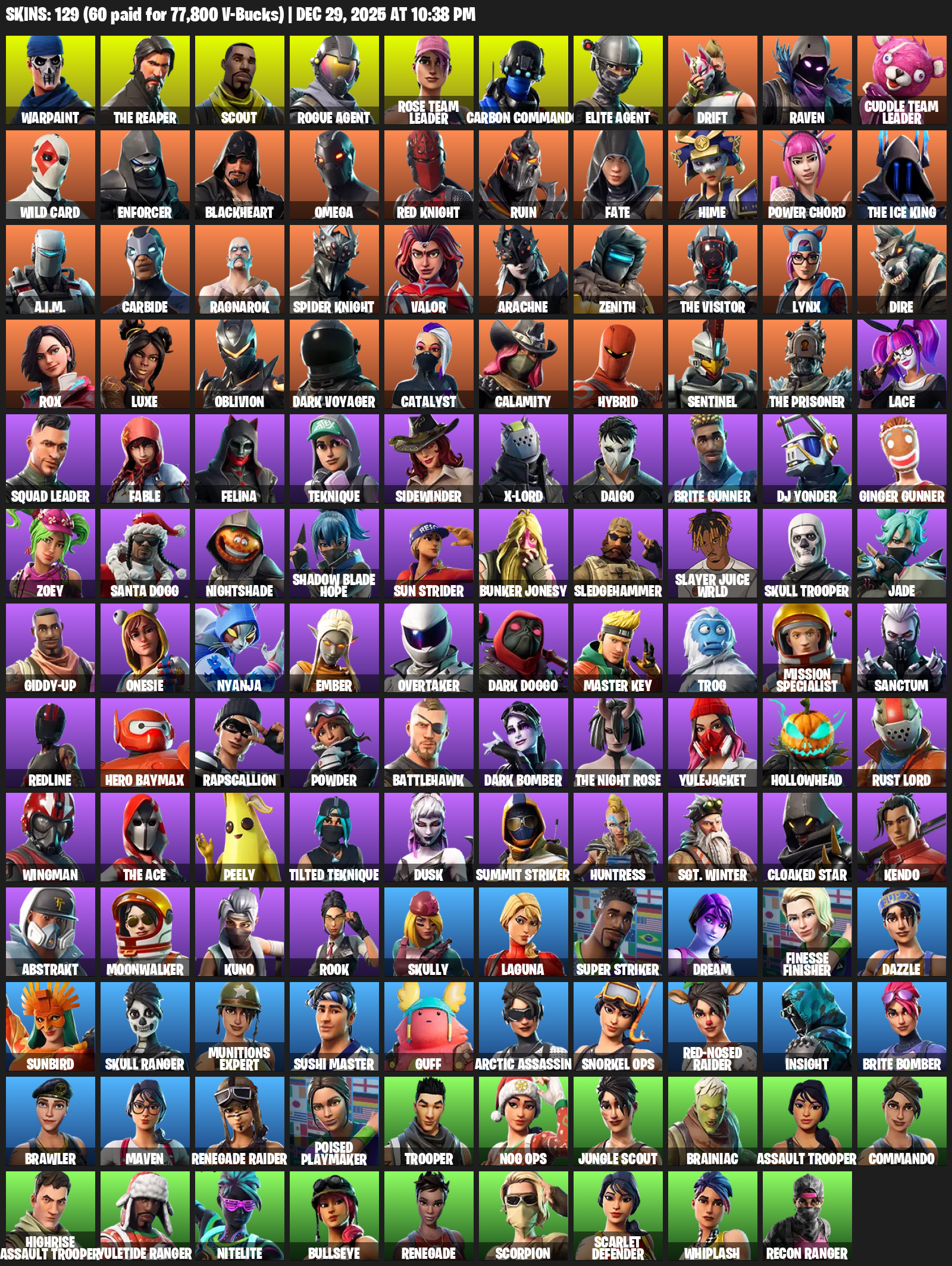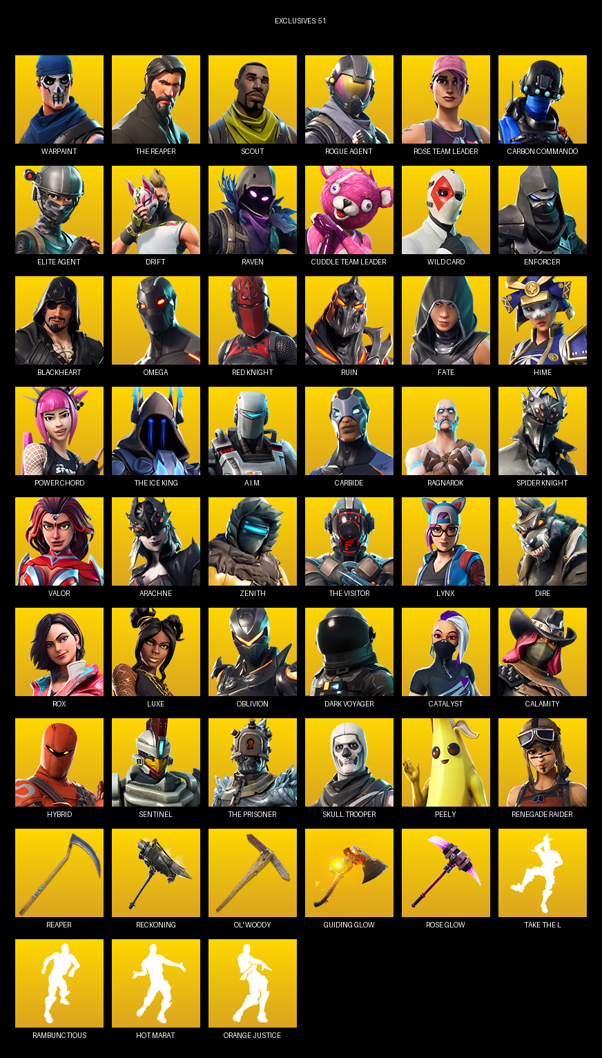 The Reaper, Elite Agent, Omega, Renegade Raider, Warpaint, Scout, Rose Team Leader, Carbon Commando, Drift, Raven, Wild Card, Enforcer, Blackheart, Red Knight, Ruin, Fate, Hime, Power Chord
