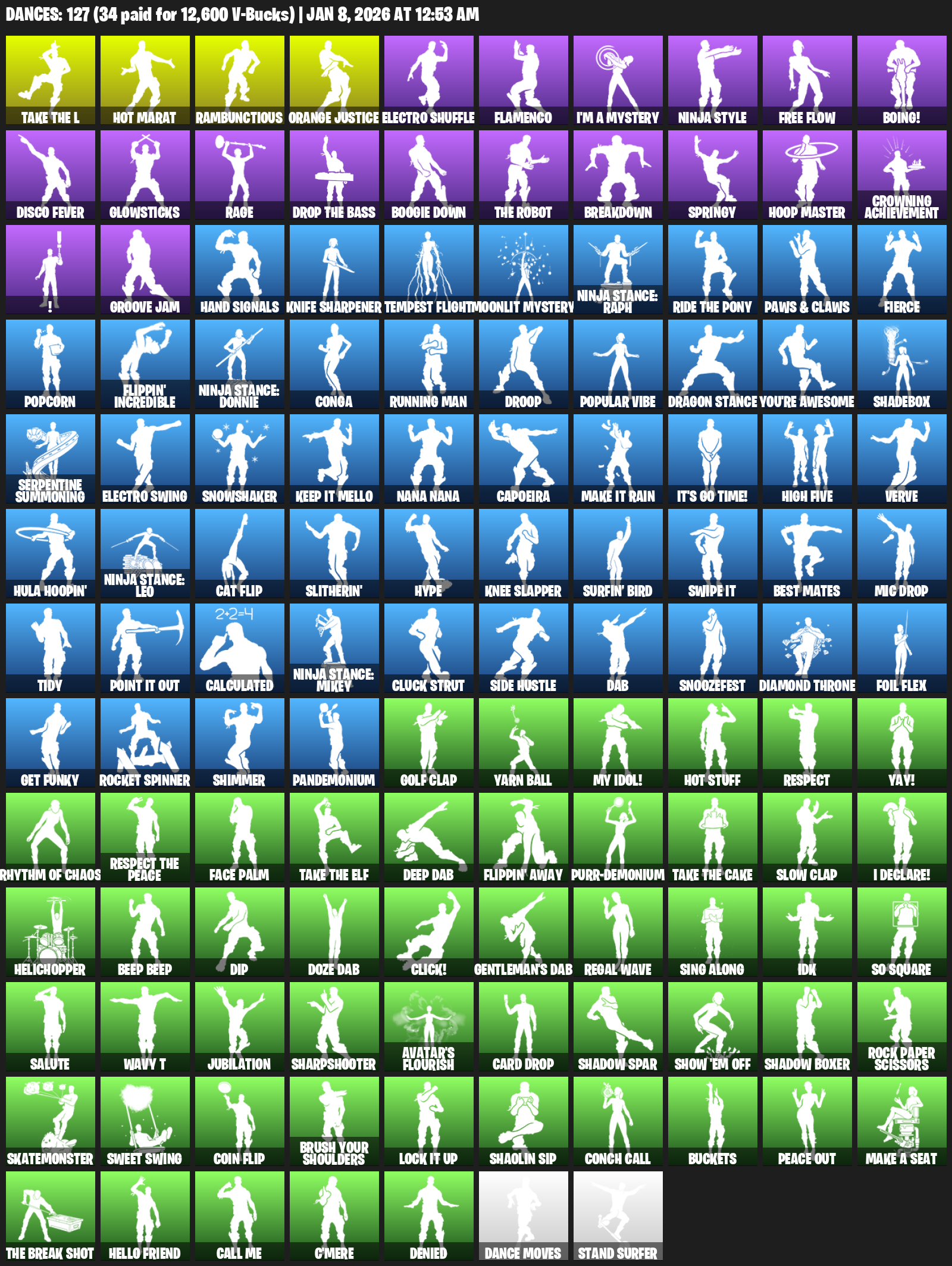 Hot Marat, Rambunctious, Orange Justice, Electro Shuffle, Flamenco, I’m a Mystery, Ninja Style, Free Flow, Boing!, Disco Fever, Glowsticks, Rage, Boogie Down, Breakdown, Springy, Hoop Master, Crowning Achievement