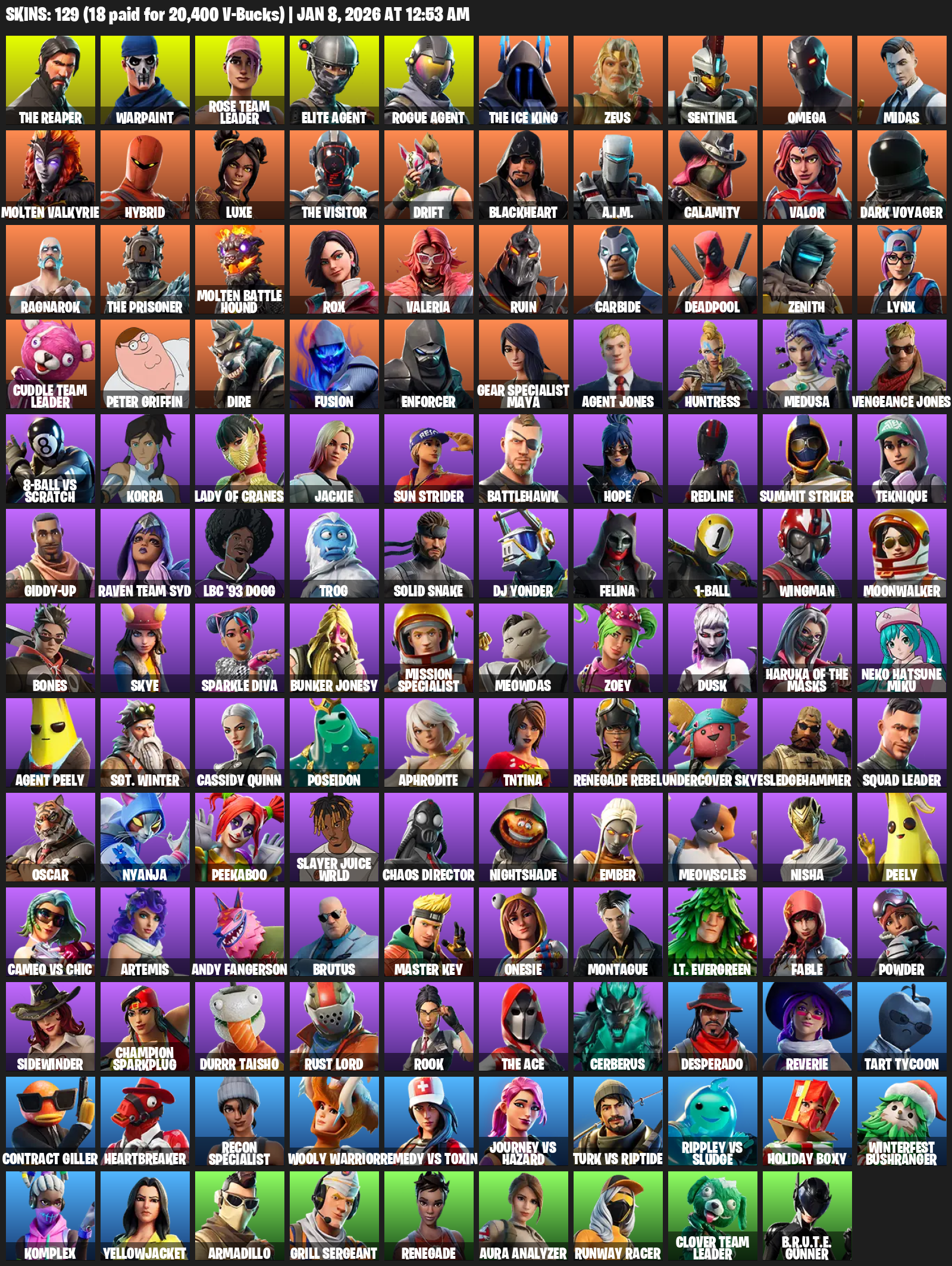 The Reaper, Elite Agent, Omega, Gear Specialist Maya, Warpaint, Rose Team Leader, Zeus, Sentinel, Midas, Molten Valkyrie, Hybrid, Luxe, Drift, Blackheart, A.I.M., Calamity, Valor