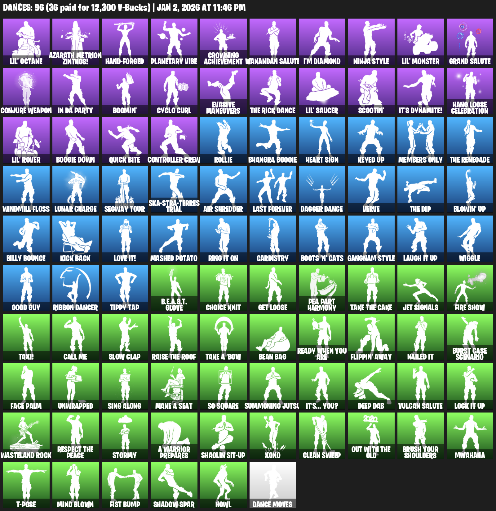 Lil’ Octane, Azarath Metrion Zinthos!, Hand-Forged, Planetary Vibe, Crowning Achievement, Wakandan Salute, I’m Diamond, Ninja Style, Conjure Weapon, In Da Party, Boomin’, Cyclo Curl, Evasive Maneuvers, Scootin’, It’s Dynamite!, Hang Loose Celebration