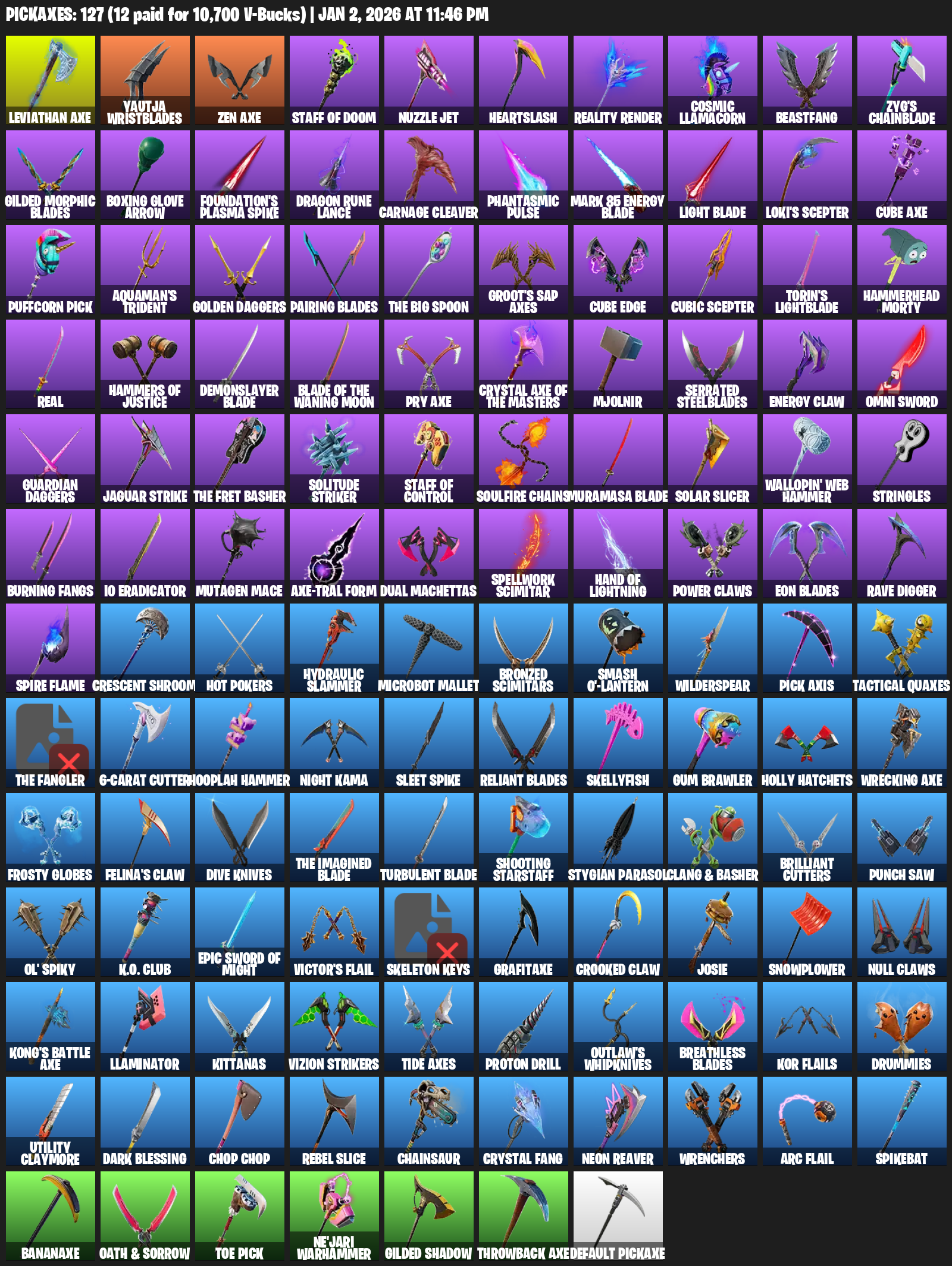 Leviathan Axe, Yautja Wristblades, Staff of Doom, Nuzzle Jet, Heartslash, Reality Render, Cosmic Llamacorn, Beastfang, Zyg’s Chainblade, Gilded Morphic Blades, Boxing Glove Arrow, Foundation’s Plasma Spike, Dragon Rune Lance, Carnage Cleaver, Phantasmic Pulse, Mark 85 Energy Blade, Loki’s Scepter