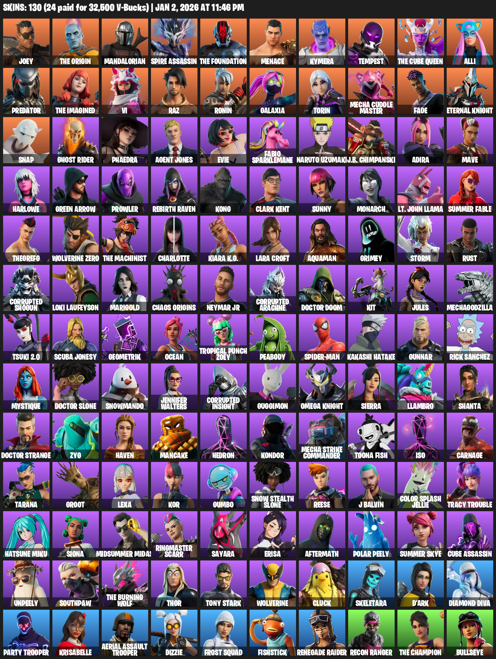 Lara Croft, Aerial Assault Trooper, Renegade Raider, Joey, The Origin, Mandalorian, Spire Assassin, Menace, Kymera, Tempest, Alli, Predator, Vi, Raz, Ronin, Galaxia, Torin