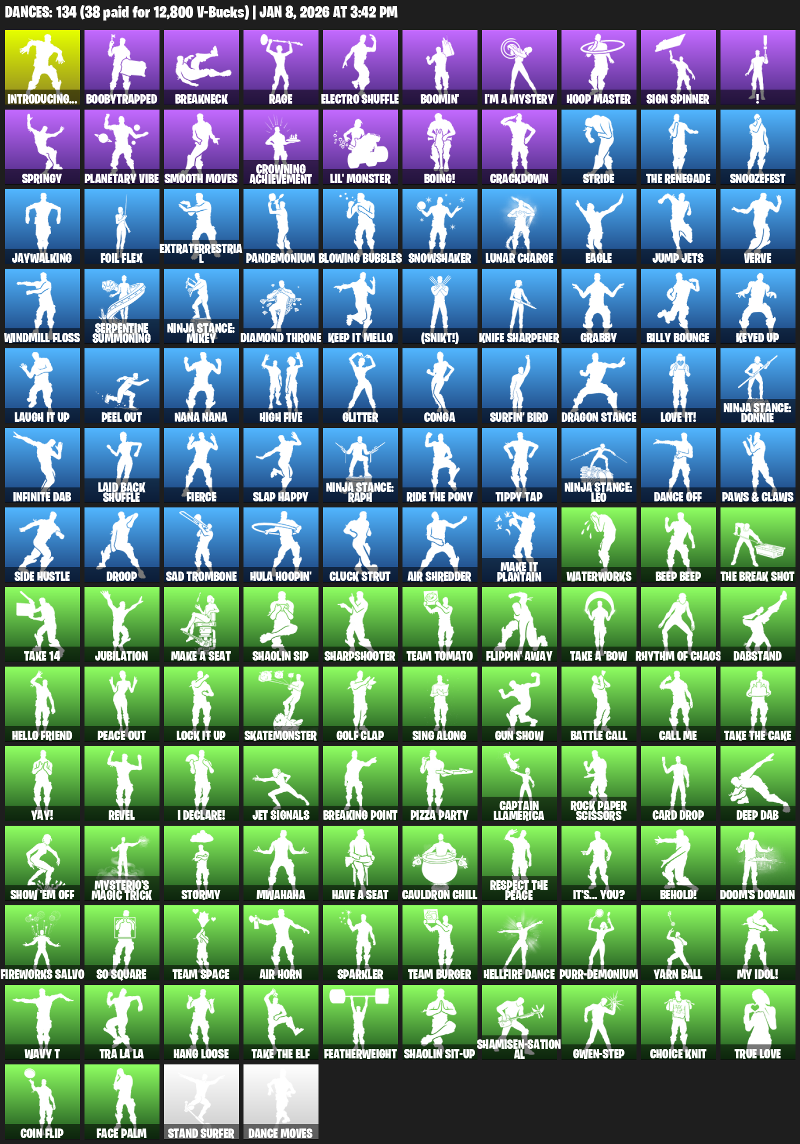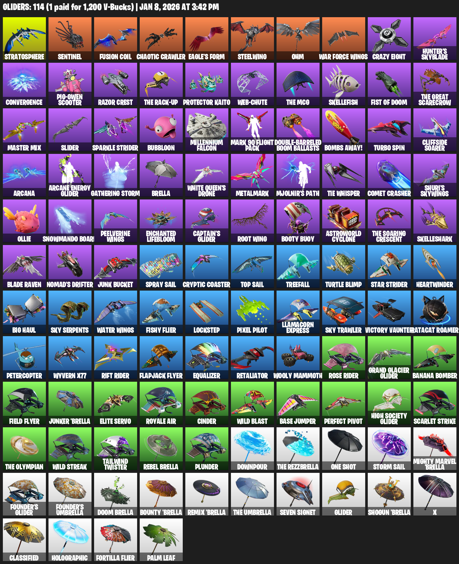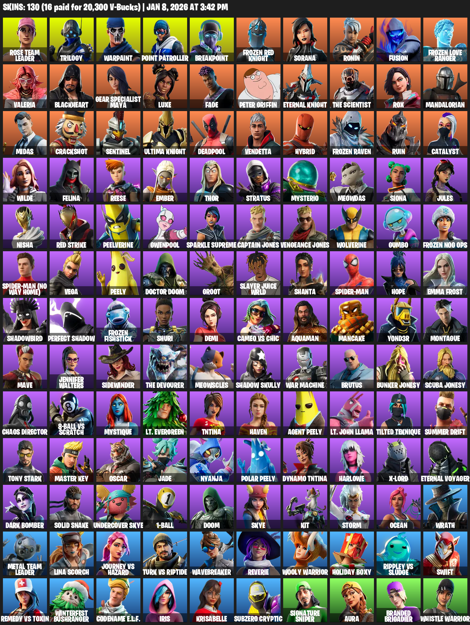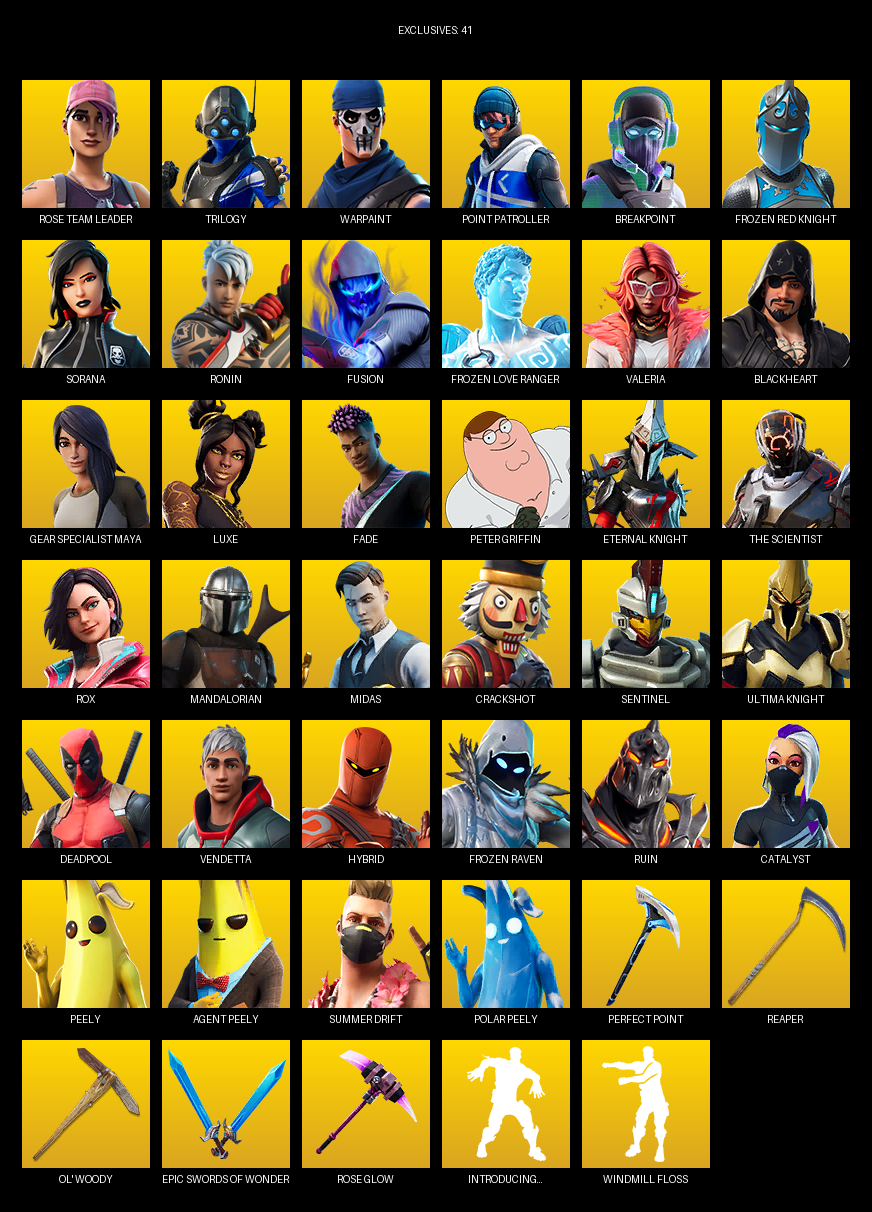 Point Patroller, Gear Specialist Maya, Rose Team Leader, Trilogy, Warpaint, Breakpoint, Frozen Red Knight, Sorana, Ronin, Fusion, Valeria, Blackheart, Luxe, Fade, Peter Griffin, The Scientist, Rox, Mandalorian