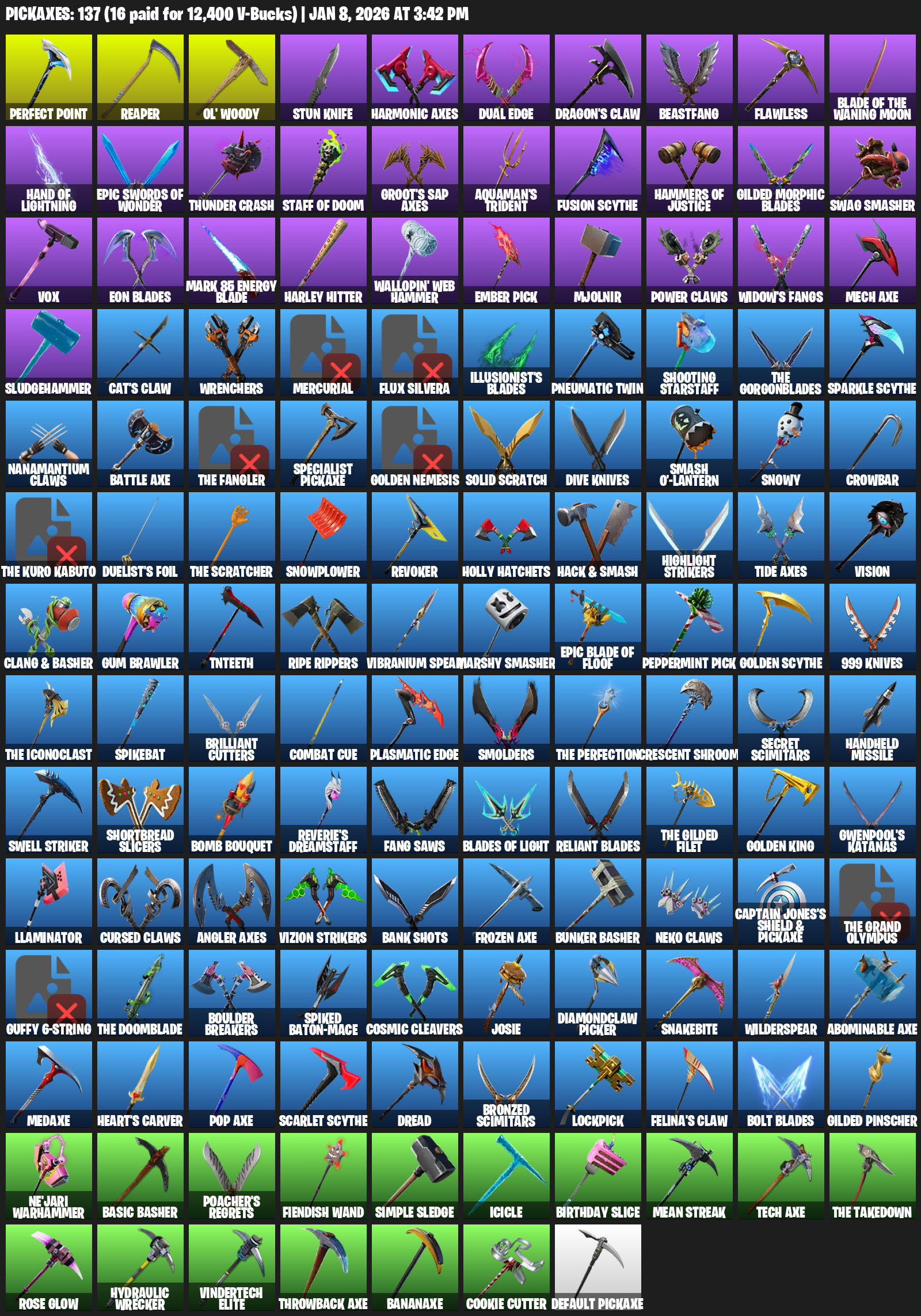 Reaper, Ol’ Woody, Stun Knife, Harmonic Axes, Dual Edge, Dragon’s Claw, Beastfang, Flawless, Hand of Lightning, Thunder Crash, Aquaman’s Trident, Gilded Morphic Blades, Swag Smasher