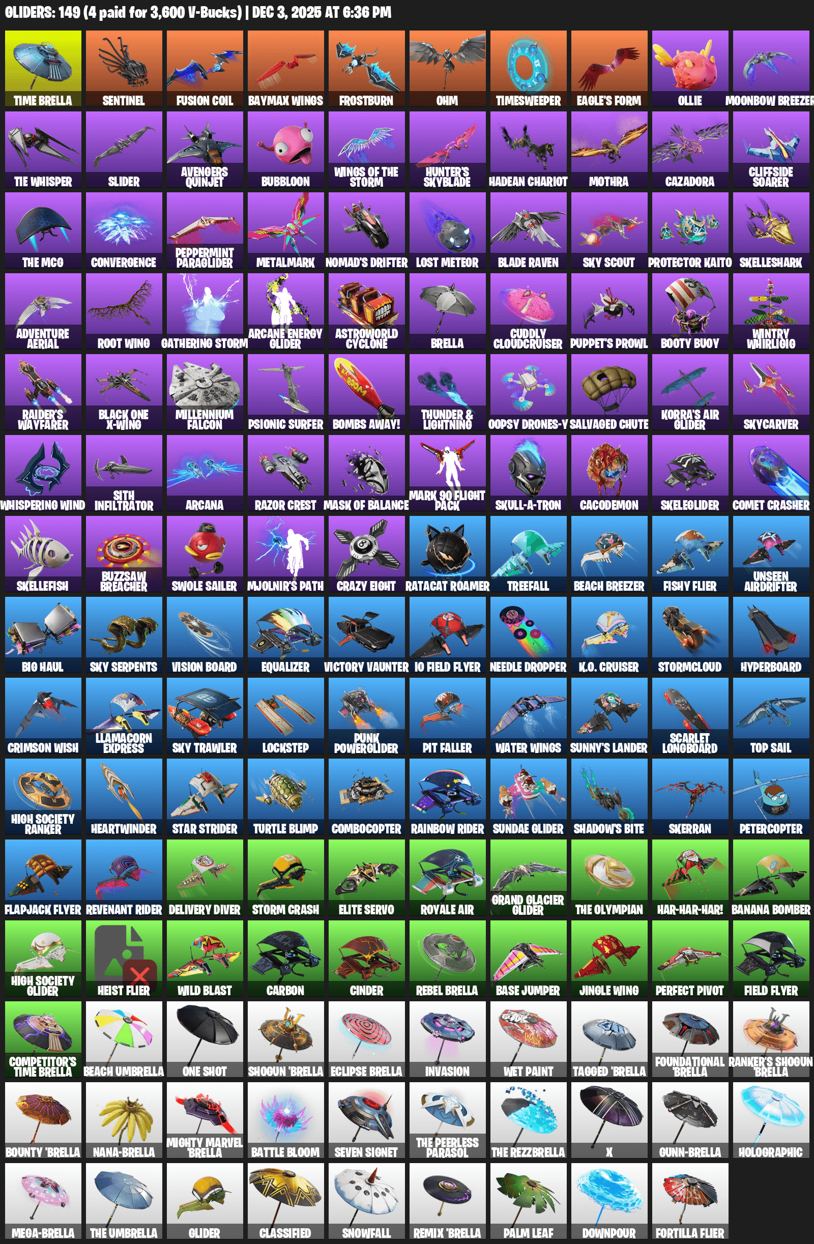 Time Brella, Sentinel, Baymax Wings, Frostburn, Ohm, Timesweeper, Eagle’s Form, Ollie, Moonbow Breezer, TIE Whisper, Slider, Avengers Quinjet, Bubbloon, Hunter’s Skyblade, Mothra, Cazadora, Cliffside Soarer