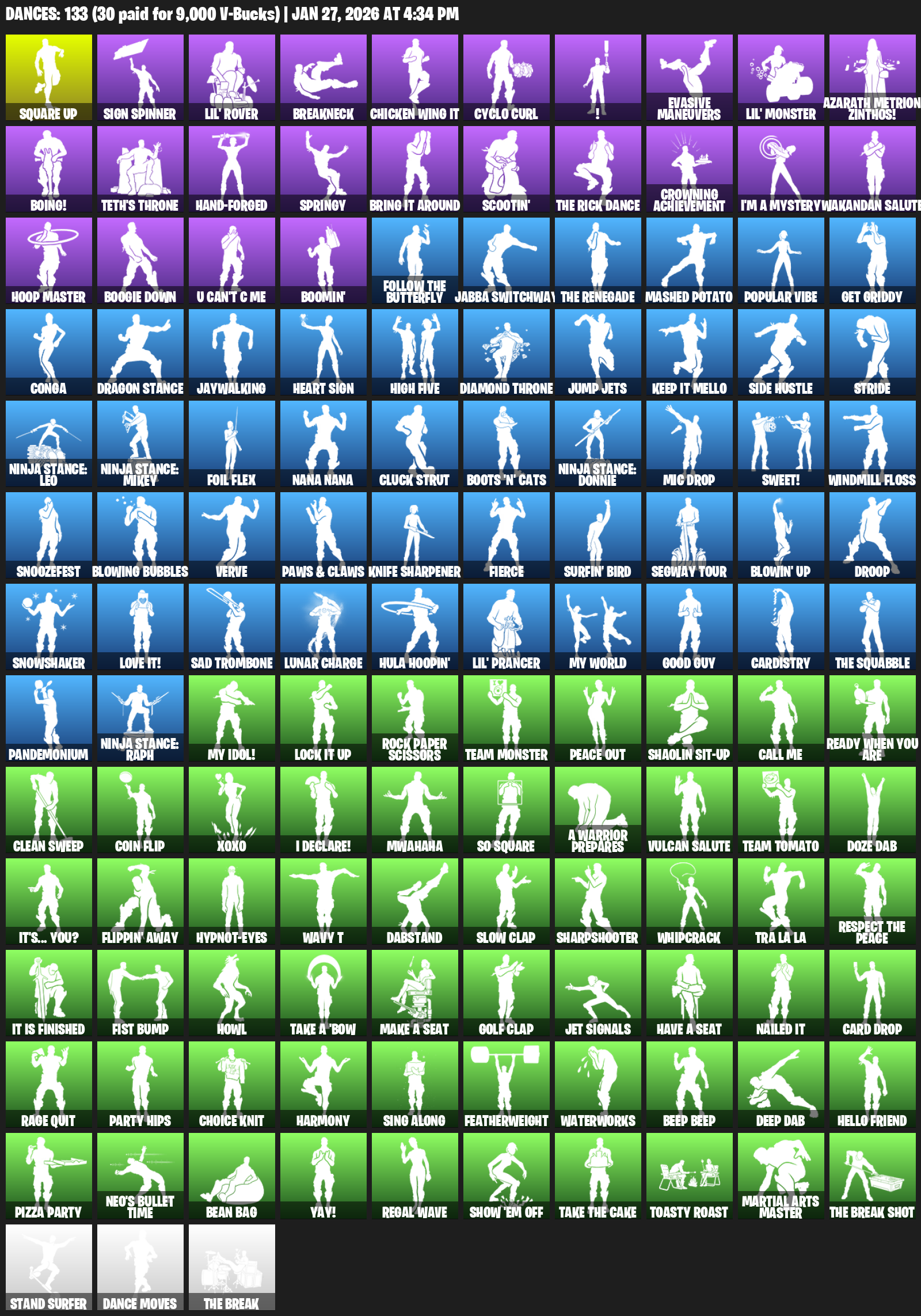 Square Up, Sign Spinner, Lil’ Rover, Breakneck, Chicken Wing It, Cyclo Curl, !, Evasive Maneuvers, Azarath Metrion Zinthos!, Boing!, Teth’s Throne, Hand-Forged, Springy, Scootin’, Crowning Achievement, I’m a Mystery, Wakandan Salute
