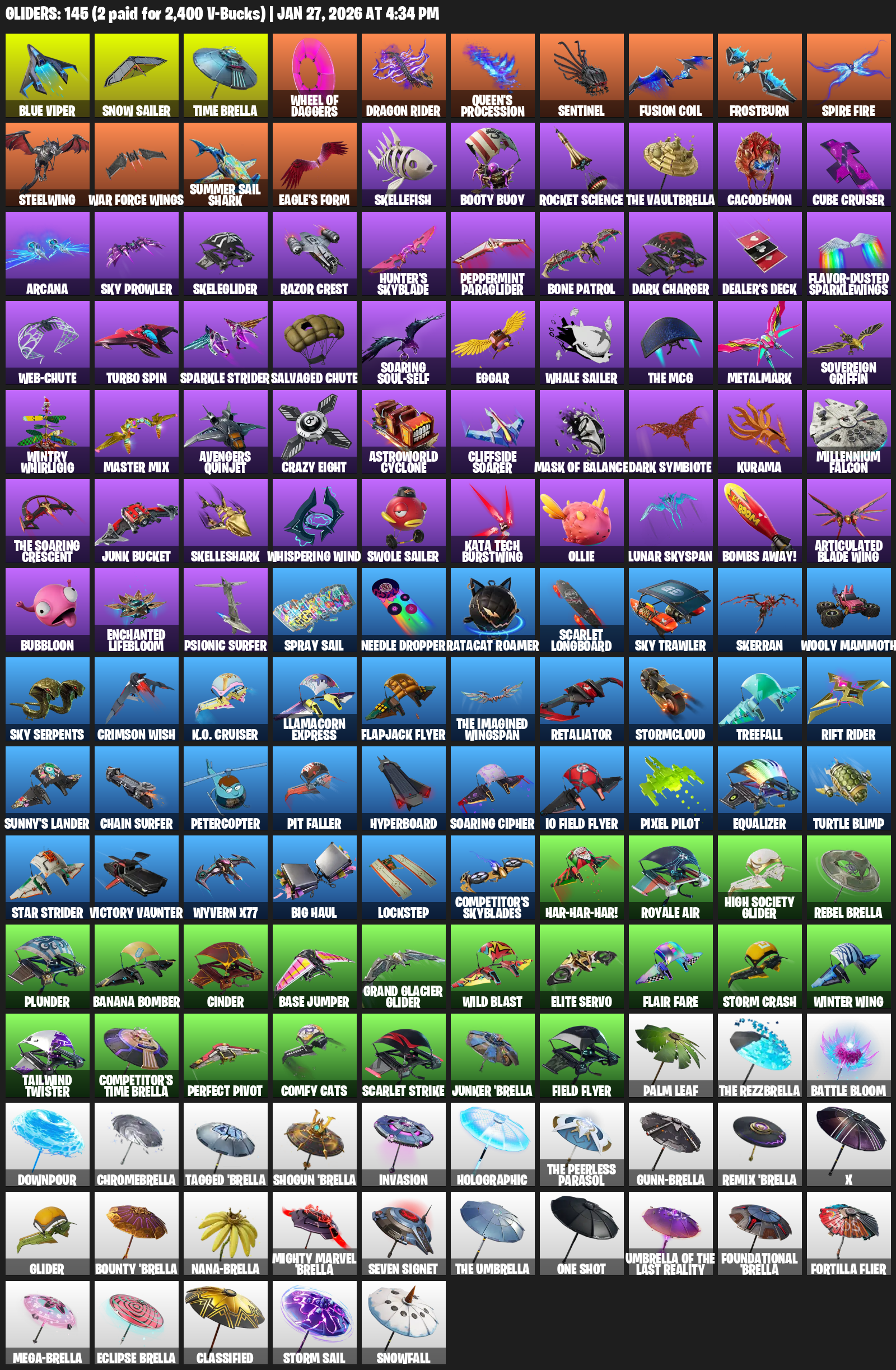 Blue Viper, Snow Sailer, Time Brella, Queen’s Procession, Sentinel, Frostburn, Steelwing, War Force Wings, Summer Sail Shark, Eagle’s Form, Skellefish, Booty Buoy, Rocket Science, Cacodemon