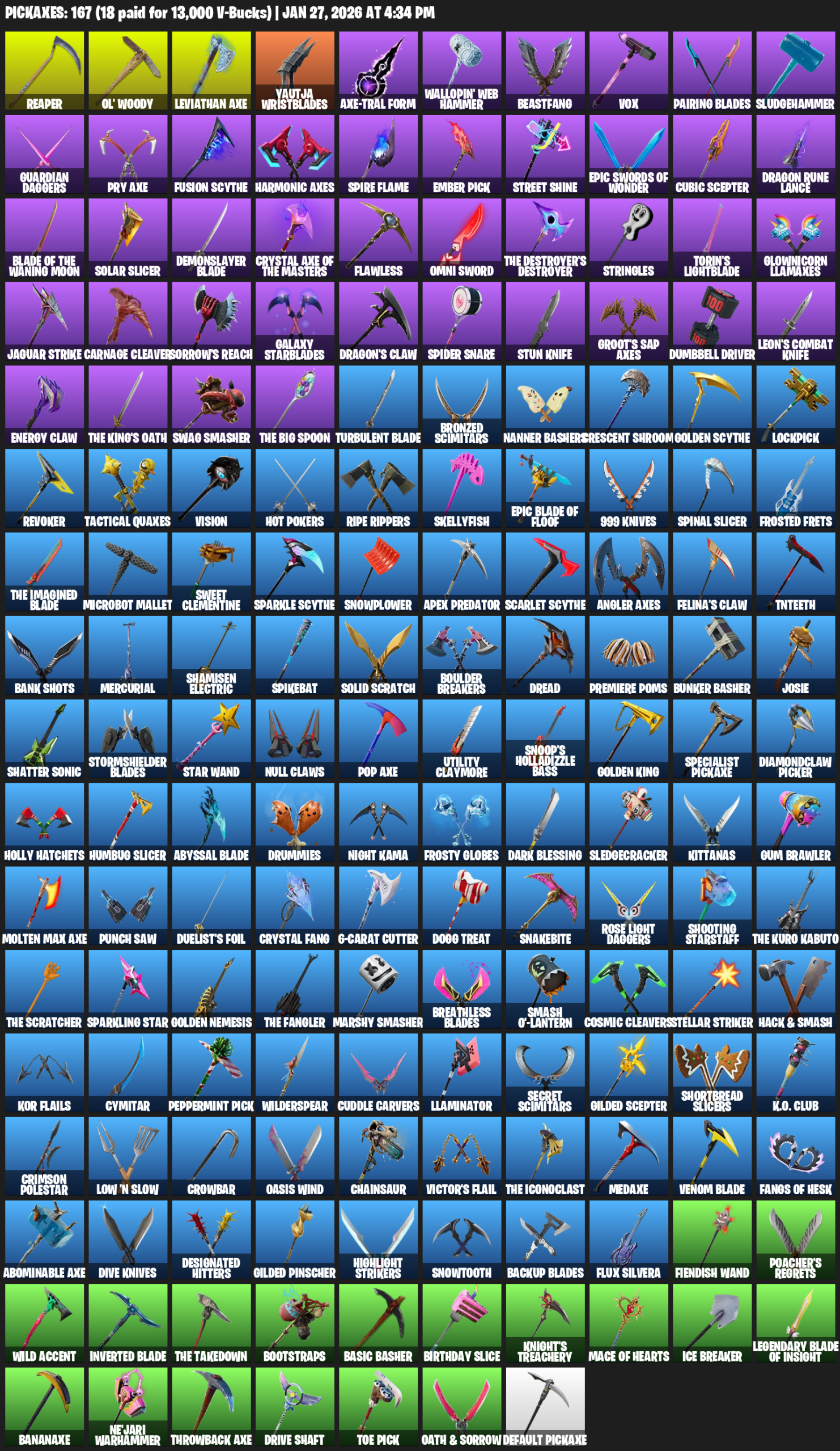 Leviathan Axe, Reaper, Ol’ Woody, Yautja Wristblades, Wallopin’ Web Hammer, Beastfang, Vox, Pairing Blades, Sludgehammer, Guardian Daggers, Fusion Scythe, Harmonic Axes, Ember Pick, Street Shine, Cubic Scepter, Dragon Rune Lance