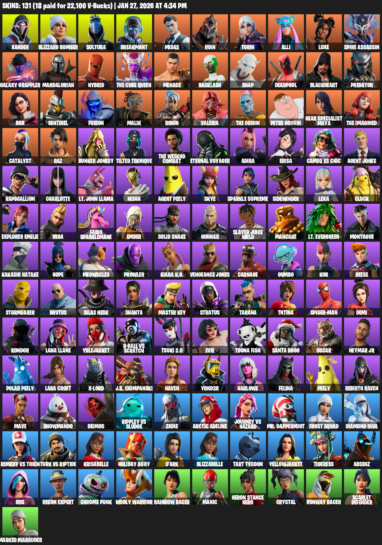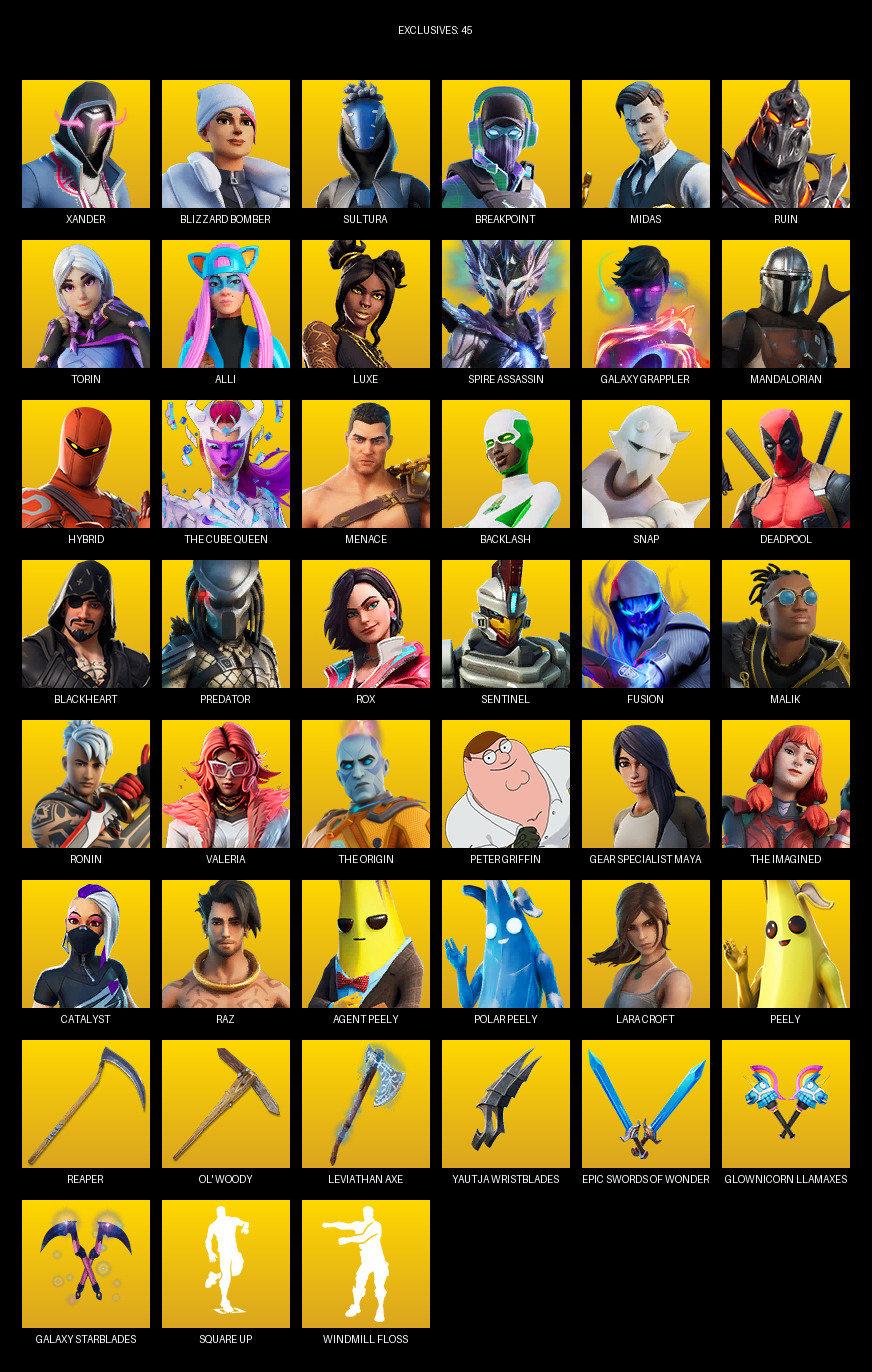 Gear Specialist Maya, Lara Croft, Xander, Blizzard Bomber, Sultura, Breakpoint, Midas, Ruin, Torin, Alli, Luxe, Spire Assassin, Galaxy Grappler, Mandalorian, Hybrid, The Cube Queen, Menace, Backlash, Snap, Deadpool